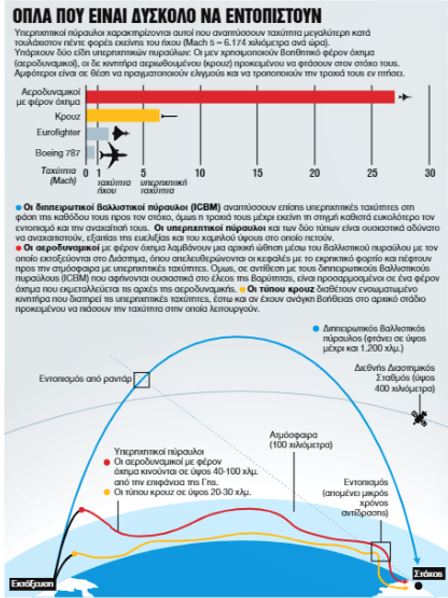 Δεν είναι, όμως, μόνο αυτό. Διότι καθώς βρισκόμαστε στην εποχή των μεγάλων ανακατατάξεων και αλλαγών στον παγκόσμιο χάρτη – οι οποίες, όπως καλά γνωρίζουν οι ισχυροί, δεν θα γίνουν μέσω… διαλόγου – οι πάντες προσπαθούν να αποκτήσουν το πάνω χέρι στη δυνατότητα άσκησης βίας. Εάν, μάλιστα, εξακολουθούν να μην έχουν ως πρώτη επιλογή το πυρηνικό τους οπλοστάσιο (σε αυτή την περίπτωση, εξάλλου, δεν θα υπάρχουν νικητές και ηττημένοι), είναι αναγκασμένοι να αποκτήσουν υπεροχή με άλλο τρόπο και με νέα όπλα, που μπορούν να φέρουν και πυρηνικά. Οπως οι σύγχρονοι υπερηχητικοί πύραυλοι, οι οποίοι είναι σε θέση να πιάσουν… απροετοίμαστους τους απέναντι και να τους προκαλέσουν δυσάρεστες εκπλήξεις.
