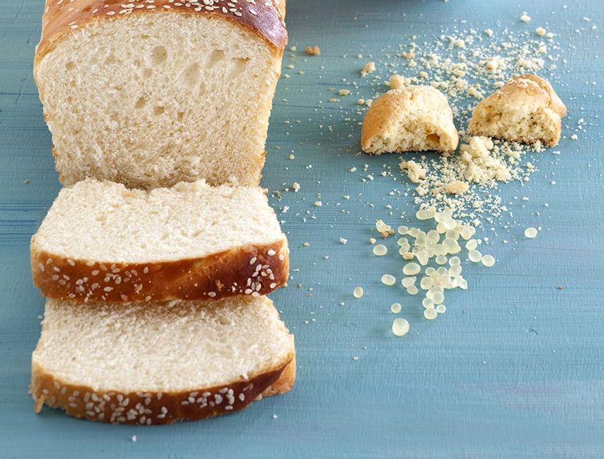 Παίρνουμε 3 κ.σ. από τη ζάχαρη και τη χτυπάμε στο μούλτι με τη μαστίχα, να γίνουν σκόνη. Ζεσταίνουμε το γάλα ώστε να είναι ελαφρώς χλιαρό. Ρίχνουμε μία κούπα από το χλιαρό γάλα σε ένα μπολ και διαλύουμε εκεί τη μαγιά. Προσθέτουμε και 1 – 2 κ.σ. από το μετρημένο αλεύρι και ανακατεύουμε ώστε να έχουμε έναν αραιό χυλό. Τον σκεπάζουμε και τον αφήνουμε στην άκρη να φουσκώσει. Στο υπόλοιπο γάλα ρίχνουμε το βούτυρο να λιώσει και τη ζάχαρη και ανακατεύουμε. Προσθέτουμε τα αβγά ελαφρώς χτυπημένα. Αδειάζουμε στον κάδο του μίξερ το μείγμα, το υπόλοιπο αλεύρι, το μαχλέπι και το μείγμα της μαγιάς. Τα χτυπάμε με το φτερό, μέχρι να γίνουν μια ζύμη που να αρχίσει να ξεκολλάει από τα τοιχώματα του κάδου. Θέλει καλό ζύμωμα, τουλάχιστον 15 λεπτά. Λαδώνουμε ένα μεγάλο μπολ και βάζουμε εκεί τη ζύμη. Τη σκεπάζουμε με μια μεμβράνη ή πετσέτα και τη βάζουμε σε ζεστό μέρος να φουσκώσει για 1 – 1½ ώρα.