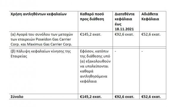 Χάριν πληρότητος σημειώνεται ότι το ποσό των €92,6 εκατ. διατέθηκε σε Δολάρια ($107,1 εκατ.) δεδομένου τα αντληθέντα κεφάλαια είναι και θα παραμείνουν κατατεθειμένα σε τραπεζικούς λογαριασμούς της Εταιρείας σε Δολάρια έως την πλήρη διάθεσή τους. Η ως άνω μερική διάθεση των αντληθέντων κεφαλαίων έλαβε χώρα την 18η Νοεμβρίου 2021 για την αγορά του συνόλου των μετοχών των εταιρειών «Poseidon Gas Carrier Corp.» και «Maximus Gas Carrier Corp.», οι οποίες κατέχουν ως Ναυλωτές Γυμνού Πλοίου βάσει Σύμβασης Χρηματοδοτικής Μίσθωσης τα πλοία μεταφοράς υγροποιημένου φυσικού αερίου LNG/C Attalos, και LNG/C Asklipios, αντίστοιχα, έναντι ποσού $60.685.321 για την αγορά του συνόλου των μετοχών της «Poseidon Gas Carrier Corp.» και $46.430.112 για την αγορά του συνόλου των μετοχών της εταιρείας «Maximus Gas Carrier Corp.». Η Εταιρεία θα συνεχίσει να ενημερώνει τη Διοίκηση του Χ.Α. και της Επιτροπής Κεφαλαιαγοράς, σύμφωνα με την ισχύουσα νομοθεσία, σχετικά με τη χρήση των αντληθέντων κεφαλαίων έως την πλήρη και οριστική διάθεση των αντληθέντων κεφαλαίων. Η ενημέρωση του επενδυτικού κοινού για τη διάθεση των αντληθέντων κεφαλαίων θα γίνεται μέσω της ηλεκτρονικής ιστοσελίδας του Χ.Α., της Εταιρείας και του Ημερήσιου Δελτίου Τιμών του Χ.Α.