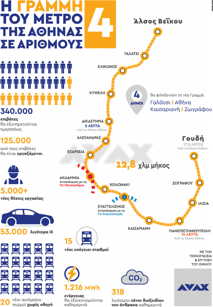 Ενας νέος κύκλος έργων για τη Γραμμή 4 του μετρό, που σε πρώτη φάση θα ενώσει το Αλσος Βεΐκου με το Γουδή, ξεκινά για να εξυπηρετεί καθημερινά 340.000 επιβάτες. Εκτιμάται ότι θα τραβήξει χειρόφρενο σε επιπλέον 53.000 ΙΧ ημερησίως, τα οποία δεν θα κυκλοφορούν σε επιβαρυμένες γειτονιές, όπως Κυψέλη, Εξάρχεια, Αλεξάνδρας, Γαλάτσι, Ιλίσια, Καισαριανή, Πανεπιστημιούπολη, Ζωγράφου, Γουδί. Αυτό θα οδηγήσει σε μείωση των εκπομπών CO2 κατά 318 τόνους ημερησίως.