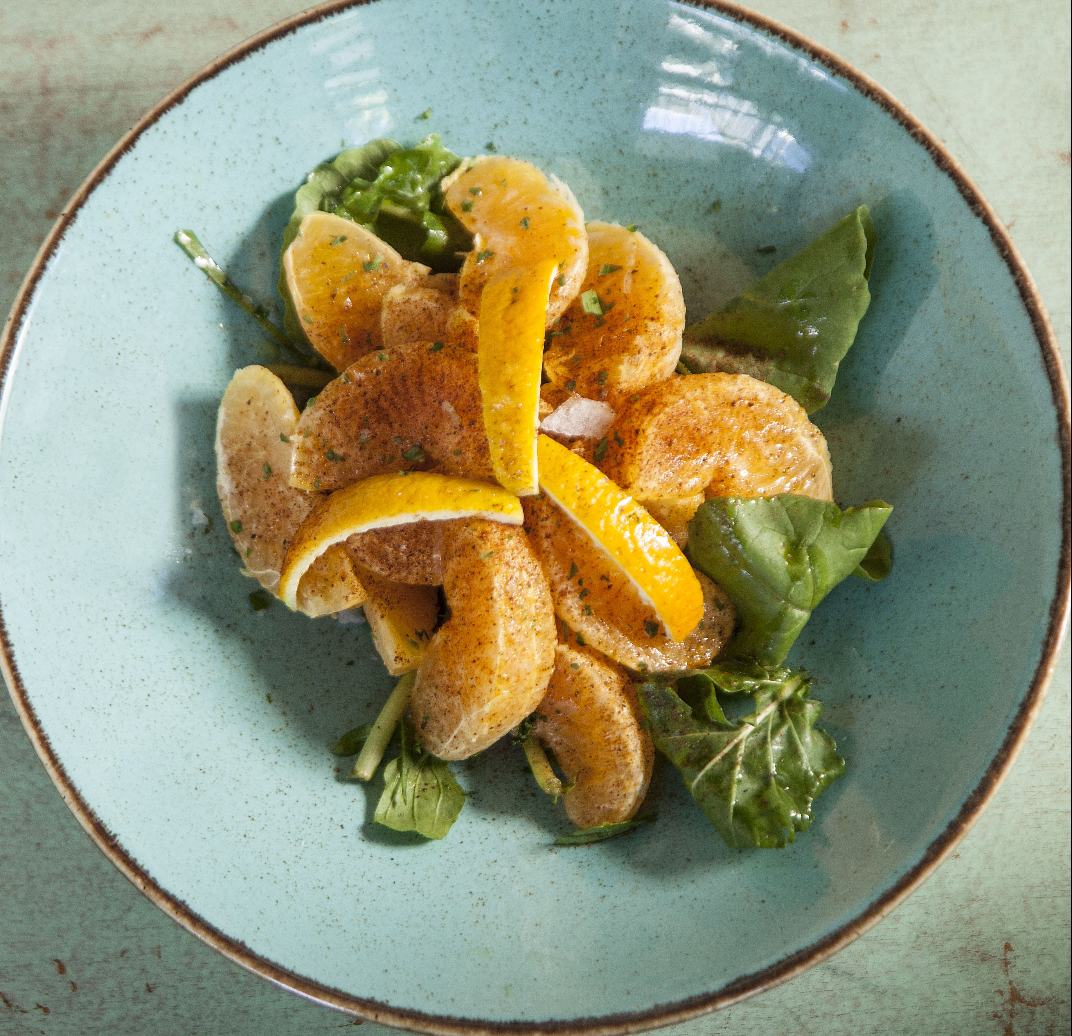 Καθαρίζουμε τα πορτοκάλια από τη φλούδα τους και την άσπρη μεμβράνη. Πλένουμε, στεγνώνουμε και χοντροκόβουμε τη ρόκα. Κόβουμε το πορτοκάλι, όπως την ντομάτα στην ντοματοσαλάτα, ανακατεύουμε με τη ρόκα. Αλατίζουμε και προσθέτουμε την πάπρικα και το λάδι.