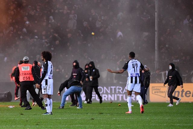 Από τα μέσα του δευτέρου μέρους είχαν αρχίσει οι οπαδοί του ΠΑΟΚ να πετούν φωτοβολίδες και αντικείμενα στον αγωνιστικό χώρο, με την κατάσταση να ξεφεύγει στα τελευταία λεπτά, με τον Σκωτσέζο διαιτητή, Μάντεν, να διακόπτει το παιχνίδι.