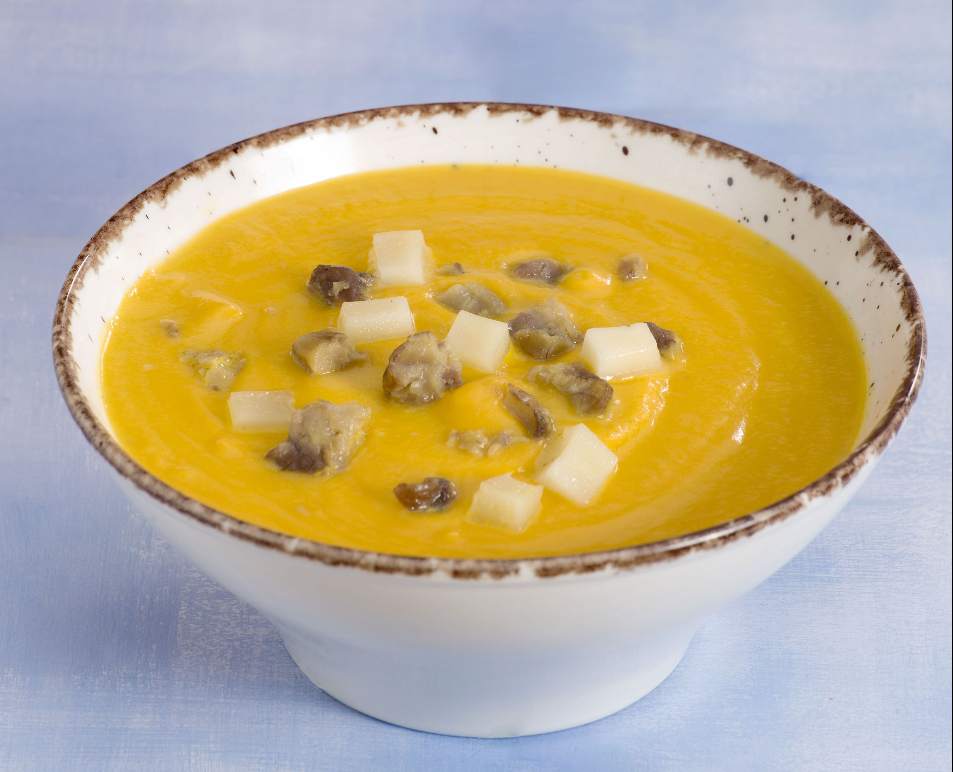 Ρίχνουμε σε ένα τηγανάκι το βούτυρο και το τοποθετούμε σε μέτρια προς δυνατή φωτιά. Μόλις λιώσει και ζεσταθεί το βούτυρο, ρίχνουμε μέσα τα κάστανα για να τα καραμελώσουμε. Μοιράζουμε τη σούπα σε 6 βαθιά πιάτα και ρίχνουμε στο κέντρο από 1 κουταλιά γιαούρτι. Πασπαλίζουμε με καραμελωμένα κάστανα και μερικούς κύβους γραβιέρα.