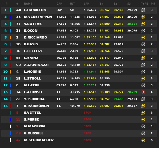 Ο Βρετανός οδηγός της Mercedes, κάνοντας και τον ταχύτερο γύρο, κάλυψε τη διαφορά των οκτώ βαθμών που τον χώριζε από τον Ολλανδό Μαξ Φερστάπεν της Red Bull, ο οποίος τερμάτισε δεύτερος, κι έτσι παγκόσμιος πρωταθλητής θα αναδειχθεί όποιος από τους δύο «πιλότους» τερματίσει ψηλότερα την επόμενη Κυριακή (12/12).