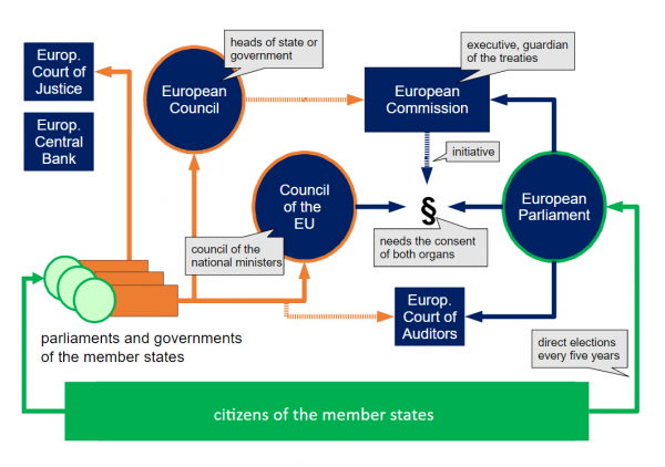 Πριν από όλα, αξίζει να σημειωθεί ότι στη δομή της Ευρωπαϊκής Ένωσης, με βάση τις ισχύουσες Συνθήκες, υπάρχουν τρεις θεσμοί που είναι αιρετοί, άμεσα ή έμμεσα: Η Ευρωβουλή, τα μέλη της οποίας εκλέγονται απευθείας από τους πολίτες κάθε πέντε χρόνια. Η Ευρωπαϊκή Επιτροπή, γνωστή και ως Κομισιόν, τα μέλη της οποίας προτείνονται από τα κράτη-μέλη και εγκρίνονται από την Ευρωβουλή. Και το Ευρωπαϊκό Συμβούλιο, που απαρτίζεται από τους εκλεγμένους επικεφαλής κρατών και κυβερνήσεων των «27» – ή, σε επιμέρους επίπεδο, από τους αρμόδιους υπουργούς.