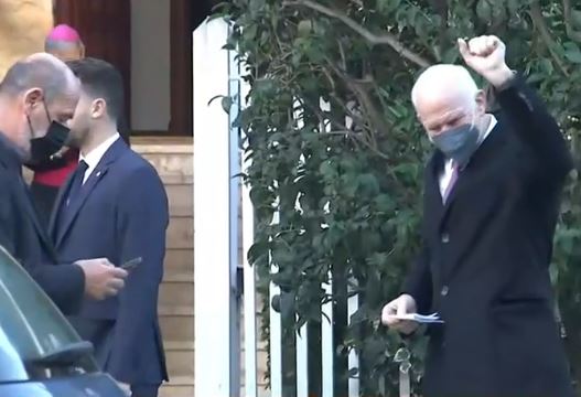 Ο πρώην πρωθυπουργός χαιρέτισε τους δημοσιογράφους, έκανε το σήμα της νίκης και εισήλθε στην κατοικία του αρχηγού της καθολικής εκκλησίας, ο οποίος αποχωρεί σήμερα από την Ελλάδα.
