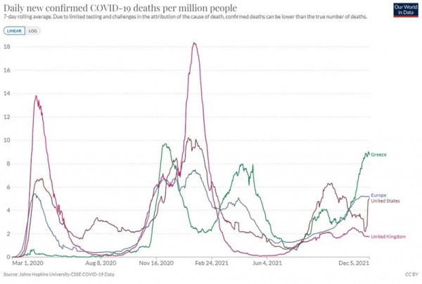 Σο γράφημα του ourworldindata.org φαίνεται ότι η χώρα μας δυστυχώς ανεβαίνει ολοένα και υψηλότερα στους νεκρούς ανά εκατομμύριο ανθρώπους, διαγράφοντας μια πορεία η οποία δεν έχει σχέση με εκείνη των άλλων χωρών του Δυτικού κόσμου.