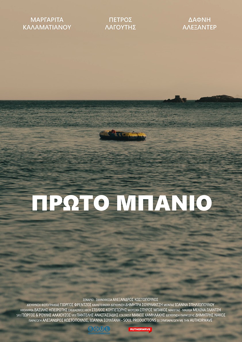 Πρώτο Μπάνιο – First Swim | Cast: Μαργαρίτα Καλαματιανού, Πέτρος Λαγούτης, Δάφνη Αλεξάντερ | Σενάριο – Σκηνοθεσία: Αλέξανδρος Κωστόπουλος | Διεύθυνση Φωτογραφίας: Γιώργος Φρέντζος | Καλλιτεχνική Διεύθυνση: Δήμητρα Σουρλαντζή | Μοντάζ: Ιωάννα Σπηλιοπούλου | Πρωτότυπη Μουσική: Σπύρος Μπάκος | Ηχοληψία: Βασίλης Ηπειρώτης | Σχεδιασμός & Μίξη Ήχου: Στέλιος Κουπετώρης | Μακιγιάζ: Μελίνα Γλαντζή | Color Correction: Μάνος Χαμηλάκης | SFX: Γιώργος & Ρούλης Αλαχούζος | VFX: Παντελής Αναστασιάδης | Βοηθός Σκηνοθέτη: Γιώργος Βασσάλος | Σκριπτ: Έλενα Παπασταύρου | Σχεδιασμός αφίσας: Ανδρέας Βακαλιός | Διεύθυνση Παραγωγής: Δημήτρης Νάκος | Παραγωγή: Ιωάννα Σουλτάνη – SOUL Productions, Πάνος Μπίσδας – AUTHORWAVE, Αλέξανδρος Κωστόπουλος | International Sales: oriGine Films, France.