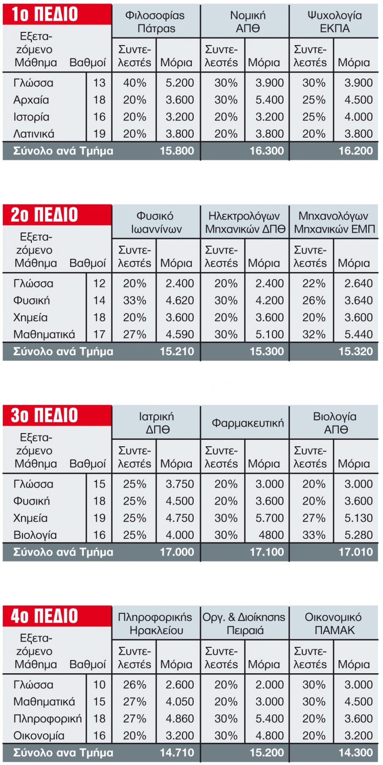 Στον πίνακα του παραδείγματος έχουμε ένα υποθετικό σενάριο, στο οποίο ένας νέος έχει γράψει στις Πανελλαδικές 15 στο μάθημα της Νέας Ελληνικής Γλώσσας, 18 στη Φυσική, 19 στη Χημεία και 16 στη Βιολογία. Τη χρονιά που μας πέρασε θα συγκέντρωνε 17.010 μόρια, με τα οποία θα διεκδικούσε την είσοδό του σε όλα τα τμήματα με αυτόν ακριβώς τον αριθμό.