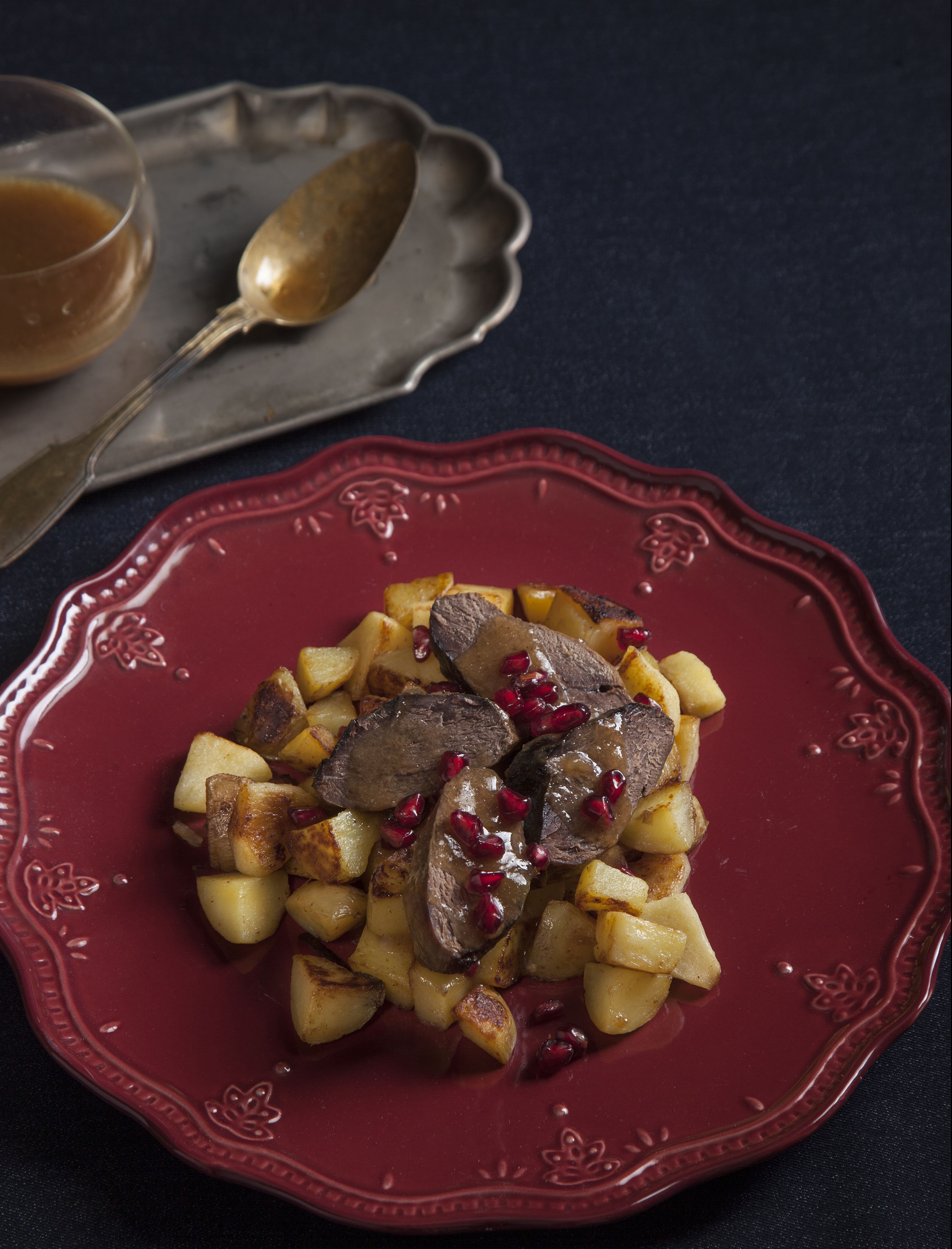 Τις στρώνουμε και από πάνω βάζουμε το κρέας και περιχύνουμε με τη σάλτσα. Πασπαλίζουμε λίγους σπόρους από ρόδι.