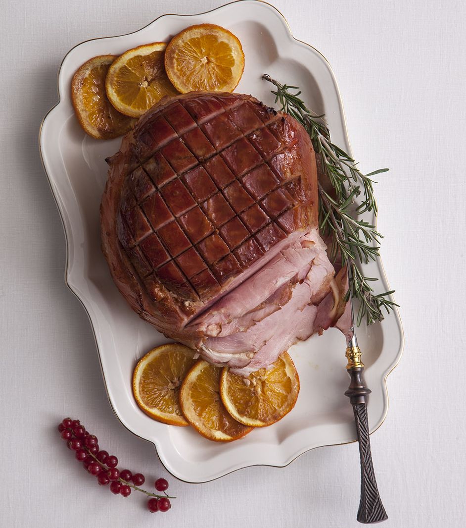 Προθερμαίνουμε τον φούρνο στους 180°C. Χαράζουμε την πλευρά με το δέρμα με ένα κοφτερό μαχαίρι σε ρόμβους 2×2 εκ. Ρίχνουμε σε ένα τηγάνι το πετιμέζι, το βούτυρο, τον χυμό πορτοκαλιού, τη μουστάρδα και τον χυμό λεμονιού και ζεσταίνουμε μέχρι να ομογενοποιηθούν τα υλικά. Αλατοπιπερώνουμε καλά το ζαμπόν. Με το μείγμα αυτό αλείφουμε το ζαμπόν και το βάζουμε σε ένα ταψί. Προσθέτουμε το κρασί, το θυμάρι, το σκόρδο και τις φέτες πορτοκαλιού. Ψήνουμε για 1 ώρα. Σερβίρουμε το ζαμπόν χλιαρό ή κρύο σε θερμοκρασία δωματίου.