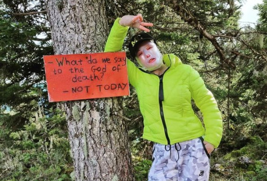 Στη φωτογραφία που ανέβασε στο Instagram στέκεται δίπλα σε μια ταμπέλα η οποία γράφει στα αγγλικά: «Τι λέμε στον Θεό του θανάτου; Όχι σήμερα» και κάνει το σήμα της νίκης με το χέρι της.