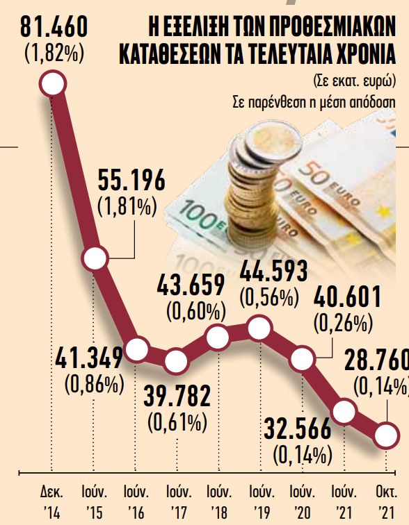 Την ίδια περίοδο τα επιτόκια υποχώρησαν κατά 93%. Σύμφωνα με τα στατιστικά στοιχεία της Τράπεζας της Ελλάδος, το μέσο ύψος τους στα προϊόντα με διάρκεια έως 1 έτος έπεσε από το 1,82% στο 0,14%. Σήμερα δε, η ανταμοιβή σε τόκους για άνοιγμα νέας προθεσμιακής κατάθεσης στους συστημικούς ομίλους είναι ακόμα πιο χαμηλή. Για ποσά άνω των 100.000 ευρώ το επίσημο «ταβάνι» στα επιτόκια είναι το 0,03%. Δηλαδή αν κάποιος τοποθετήσει 150.000 ευρώ, θα πάρει σε έναν χρόνο καθαρούς τόκους 38 ευρώ έναντι 2.700 ευρώ που λάμβανε στο τέλος του 2014 και 830 ευρώ στα μέσα του 2019.