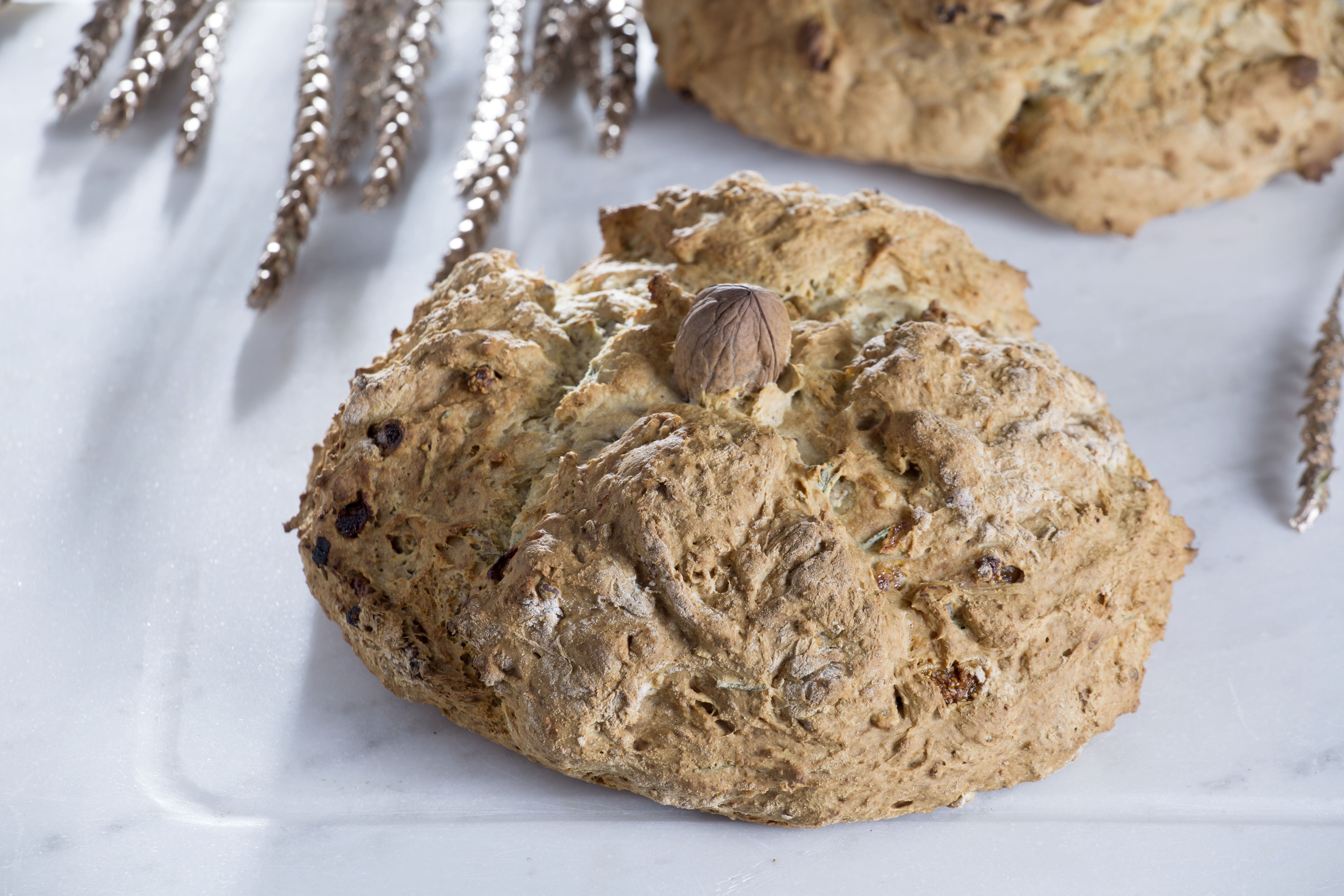 Μεταφέρουμε προσεκτικά το ψωμί πάνω στη λαδόκολλα, διορθώνουμε το σχήμα του, και χαράζουμε έναν σταυρό βάθους περίπου 2 εκ. (αυτό θα το βοηθήσει να φουσκώσει). Αν θέλουμε, μπορούμε να διακοσμήσουμε το ψωμί με ολόκληρα καρύδια με το κέλυφος. Ψήνουμε για 30-35 λεπτά. Για να καταλάβουμε ότι είναι έτοιμο το χτυπάμε απαλά από κάτω. Θα πρέπει να ακούγεται σαν κούφιο. Το αφήνουμε λίγο να κρυώσει πάνω σε σχάρα με ποδαράκι.