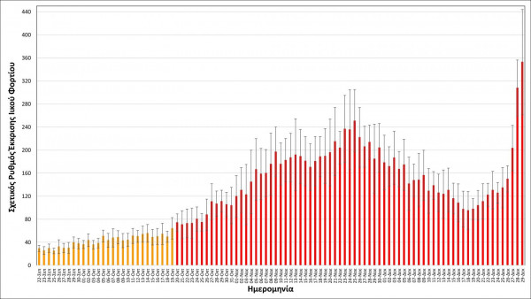 Από τις αναλύσεις καθημερινών δειγματοληψιών λυμάτων που αφορούν το διάστημα 19/12 έως τις 29/12 προκύπτει ότι το ιικό φορτίο του στελέχους Όμικρον διπλασιάζεται ανά 1,86 ημέρες.