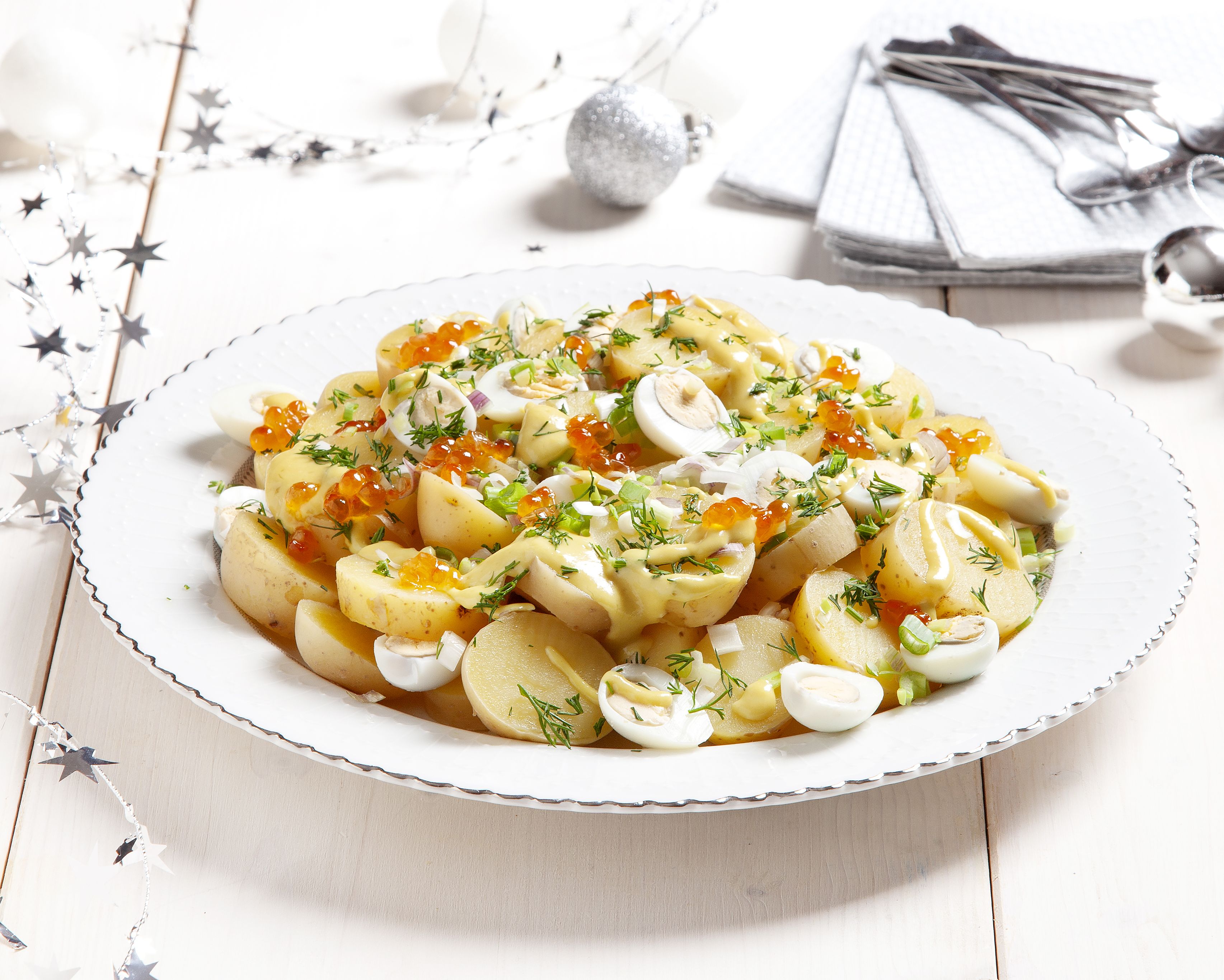 Πλένουμε καλά τις πατάτες και τις βάζουμε με τη φλούδα σε μια μεγάλη κατσαρόλα με άφθονο κρύο νερό. Τις βάζουμε σε δυνατή φωτιά και όταν πάρουν βράση σιγοβράζουμε για περίπου 20 λεπτά ή μέχρι να μαλακώσουν (προσοχή να μην παραμαλακώσουν και αρχίζει να φεύγει η φλούδα). Στραγγίζουμε, ξεπλένουμε με κρύο νερό και αφήνουμε να κρυώσουν.