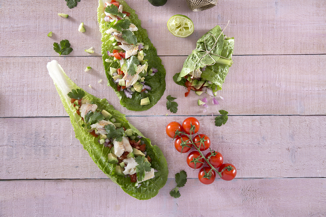 Ανακατεύουμε σε ένα μπολ το αγγούρι με τα ντοματίνια, το αβοκάντο και το κρεμμύδι. Προσθέτουμε αλατοπίπερο και χυμό από μισό λάιμ. Ανοίγουμε τα φύλλα του μαρουλιού και πάνω τους μοιράζουμε τη σαλάτα, στη συνέχεια το ψάρι, φύλλα κόλιανδρου και τέλος στύβουμε από πάνω τον επιπλέον χυμό λάιμ. Τυλίγουμε σε wrap.
