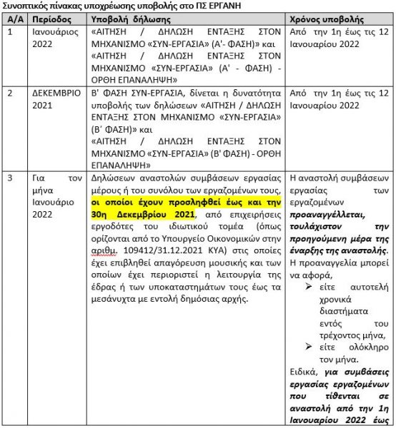 Ειδικά, για συμβάσεις εργασίας εργαζομένων που τίθενται σε αναστολή από την 1η Ιανουαρίου 2022 έως και την 10η Ιανουαρίου 2022, οι υπεύθυνες δηλώσεις των επιχειρήσεων- εργοδοτών δύνανται να υποβληθούν από την ημέρα ενεργοποίησης του συστήματος υποβολής δηλώσεων στο ΠΣ ΕΡΓΑΝΗ και έως την 10/1/2022.