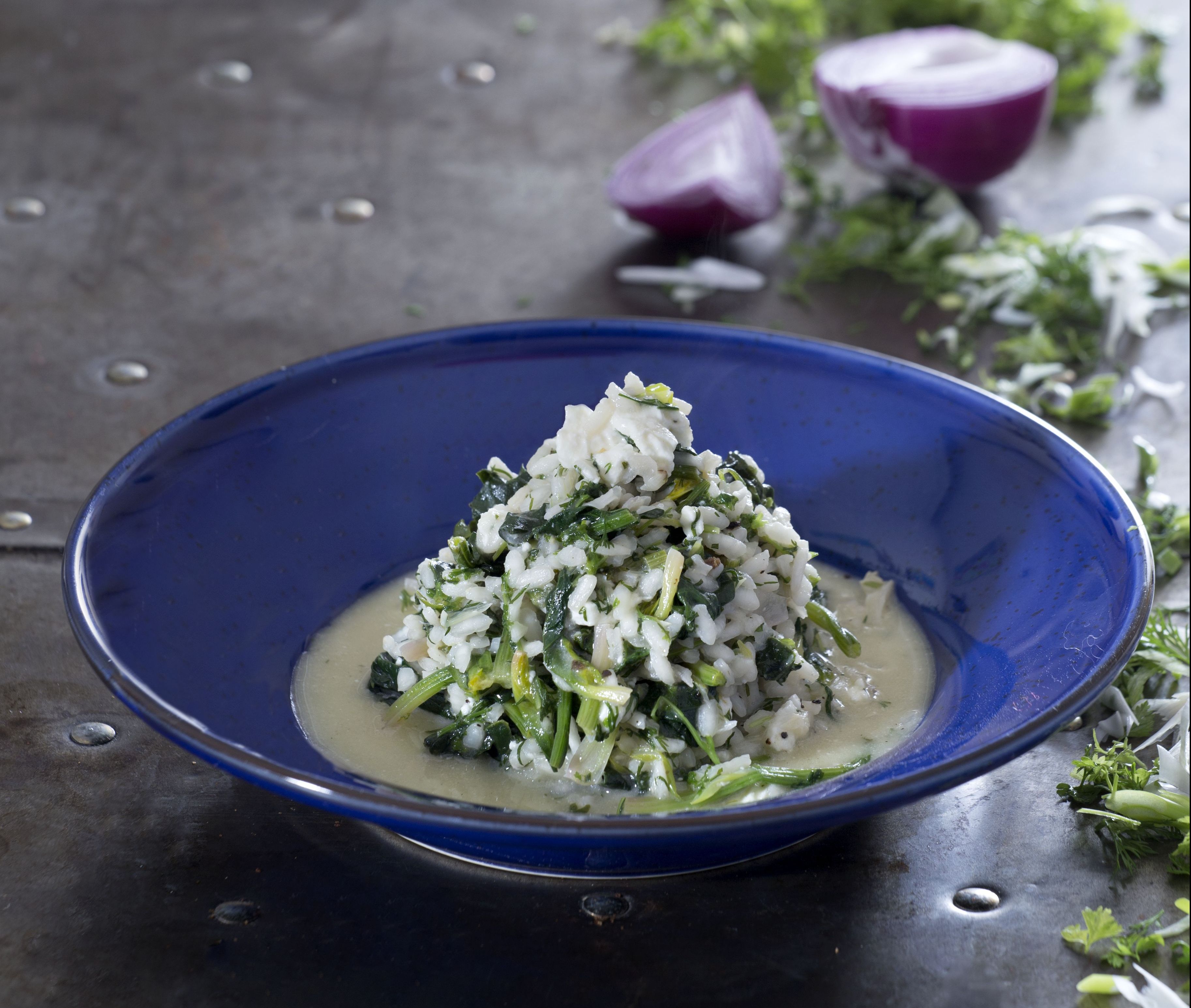 Βάζουμε ένα μεγάλο τηγάνι ή μια ρηχή και φαρδιά κατσαρόλα σε δυνατή φωτιά να κάψει και τσιγαρίζουμε εκεί το κρεμμυδάκι για 5′ – 10′. Οταν καραμελώσει, προσθέτουμε το σκόρδο και τσιγαρίζουμε για 1′ – 2′. Προσθέτουμε το ρύζι και ανακατεύουμε συνεχώς με μια ξύλινη κουτάλα, ενώ ταυτόχρονα προσθέτουμε εναλλάξ λίγο ζωμό και λίγο κρασί. Ρίχνουμε μόνο τη μισή ποσότητα από τα υγρά. Αλατοπιπερώνουμε, ενώ συνεχίζουμε να ανακατεύουμε το ρύζι μέχρι να απορροφηθούν τα υγρά. Τότε προσθέτουμε το σπανάκι και πάλι σιγά-σιγά τον υπόλοιπο ζωμό εναλλάξ με το υπόλοιπο κρασί. Η όλη διαδικασία θα μας πάρει πάνω από 15′. Ο στόχος στο ριζότο είναι με το δούλεμα στο τηγάνι να βγαίνει άμυλο από το ρύζι και να επιτύχουμε μια ωραία πλούσια υφή στο φαγητό. Οταν φτάσει το ρύζι να είναι al dente, το αποσύρουμε από τη φωτιά. Οσο είναι πολύ ζεστό, ρίχνουμε κομματιασμένη τη φέτα, τα μυρωδικά και τον χυμό λεμονιού. Δοκιμάζουμε στη γεύση και ρυθμίζουμε το αλατοπίπερο.