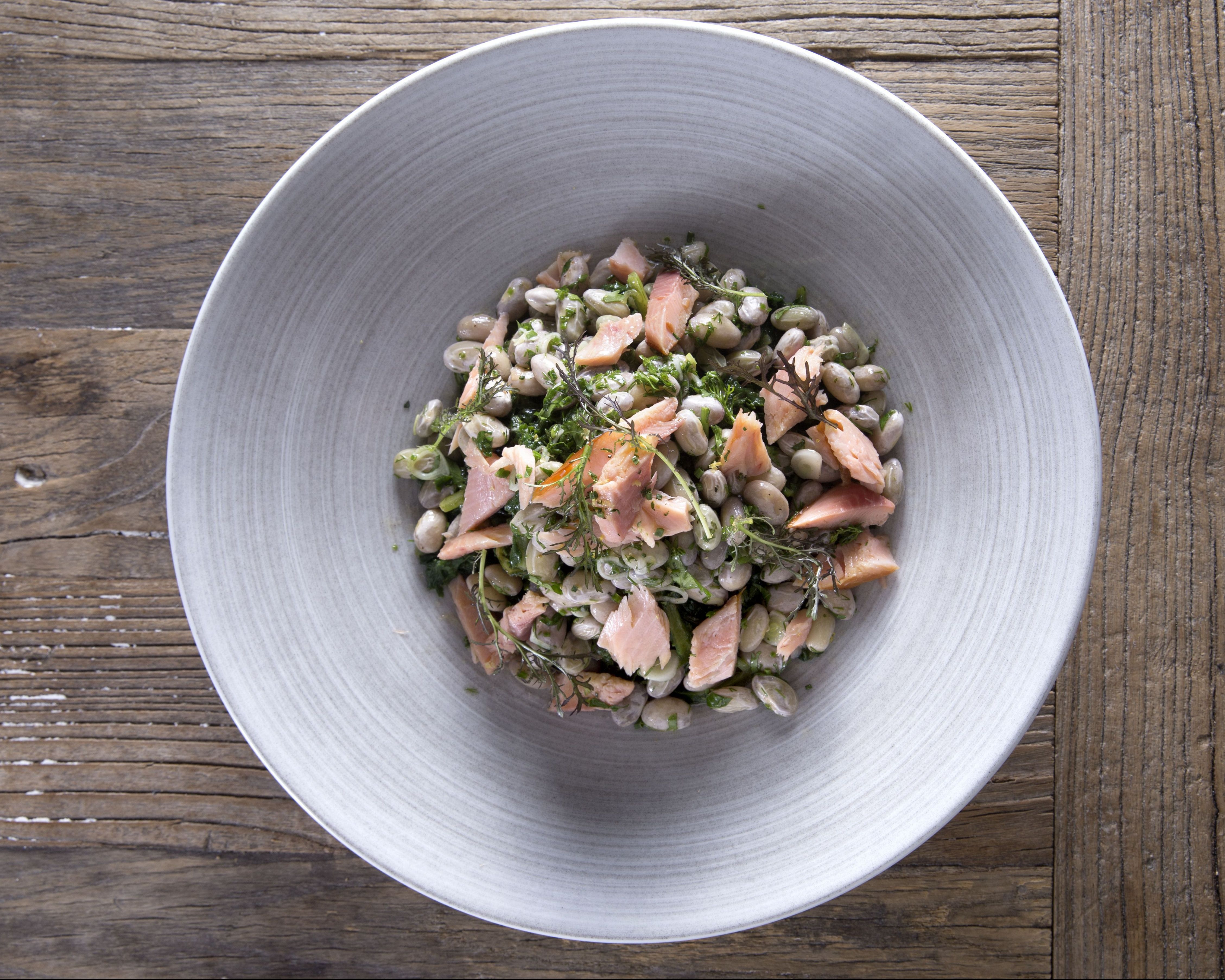 Βάζουμε σε πιατέλα τα χόρτα, από πάνω τις μαριναρισμένες χάντρες, περιχύνουμε με τη βινεγκρέτ και γαρνίρουμε με τα κομμάτια καπνιστής πέστροφας.