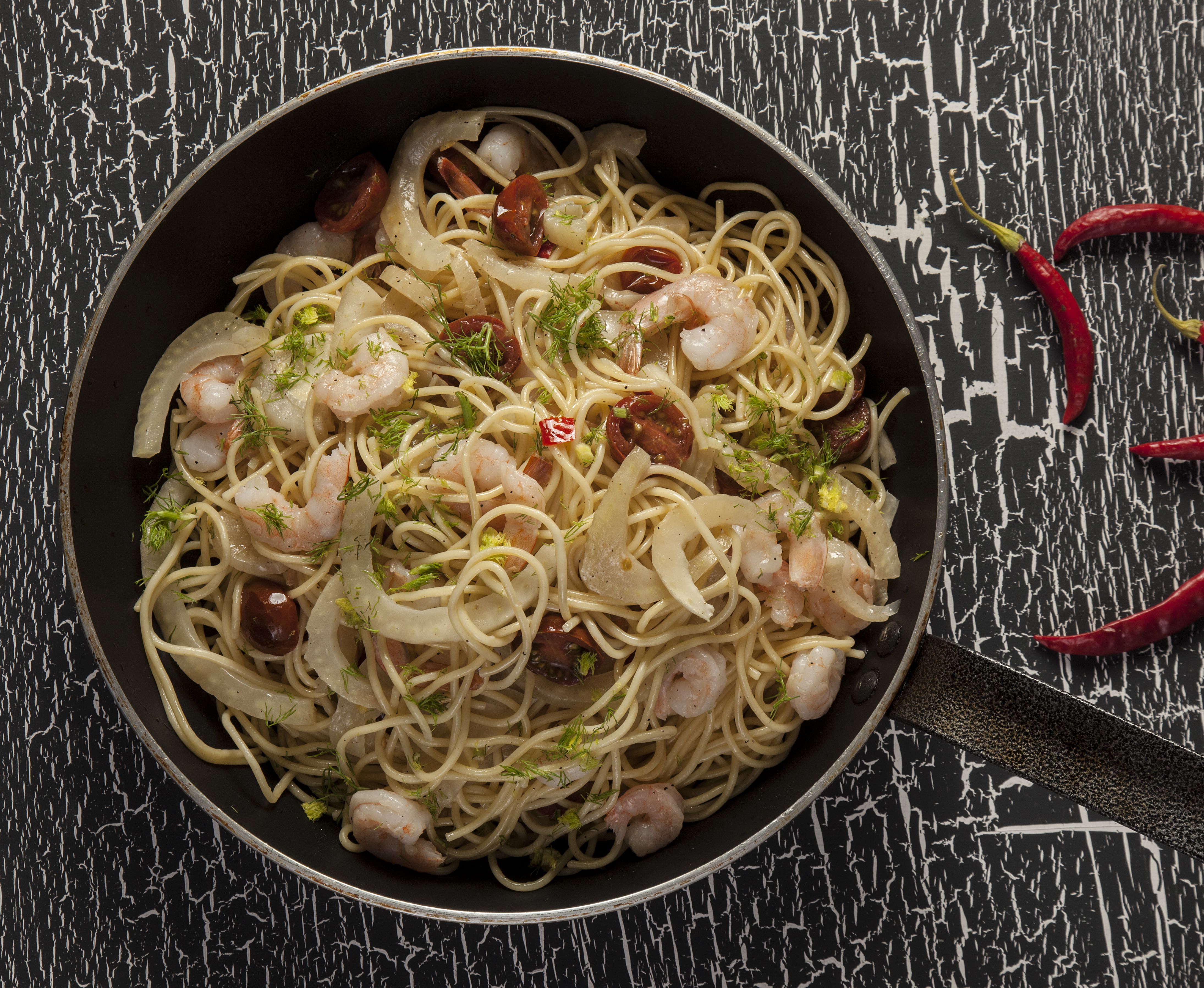 Αφαιρούμε τους σπόρους από την πιπεριά και την ψιλοκόβουμε. Τη ρίχνουμε στο τηγάνι και συνεχίζουμε το μαγείρεμα με ξεσκέπαστο το τηγάνι, μέχρι να γίνει η μαραθόριζα μαλακή και να κολλάει, ανακατεύοντας πού και πού. Κόβουμε τα ντοματίνια στη μέση και τα προσθέτουμε στο φαγητό. Ανακατεύουμε για 2′. Στη συνέχεια προσθέτουμε τις γαρίδες και ύστερα από 1′ τα σουρωμένα μακαρόνια. Ρίχνουμε λίγο από το νερό που έχουμε κρατήσει, ώστε να γίνει λίγο πιο αραιό το μείγμα, αν θέλουμε, και ανακατεύουμε να αναμειχθούν καλά τα υλικά. Αλατοπιπερώνουμε κατά βούληση και ρίχνουμε από πάνω μερικά φυλλαράκια από τη μαραθόριζα. Περιχύνουμε με λίγο ωμό ελαιόλαδο και σερβίρουμε όσο είναι ζεστό.