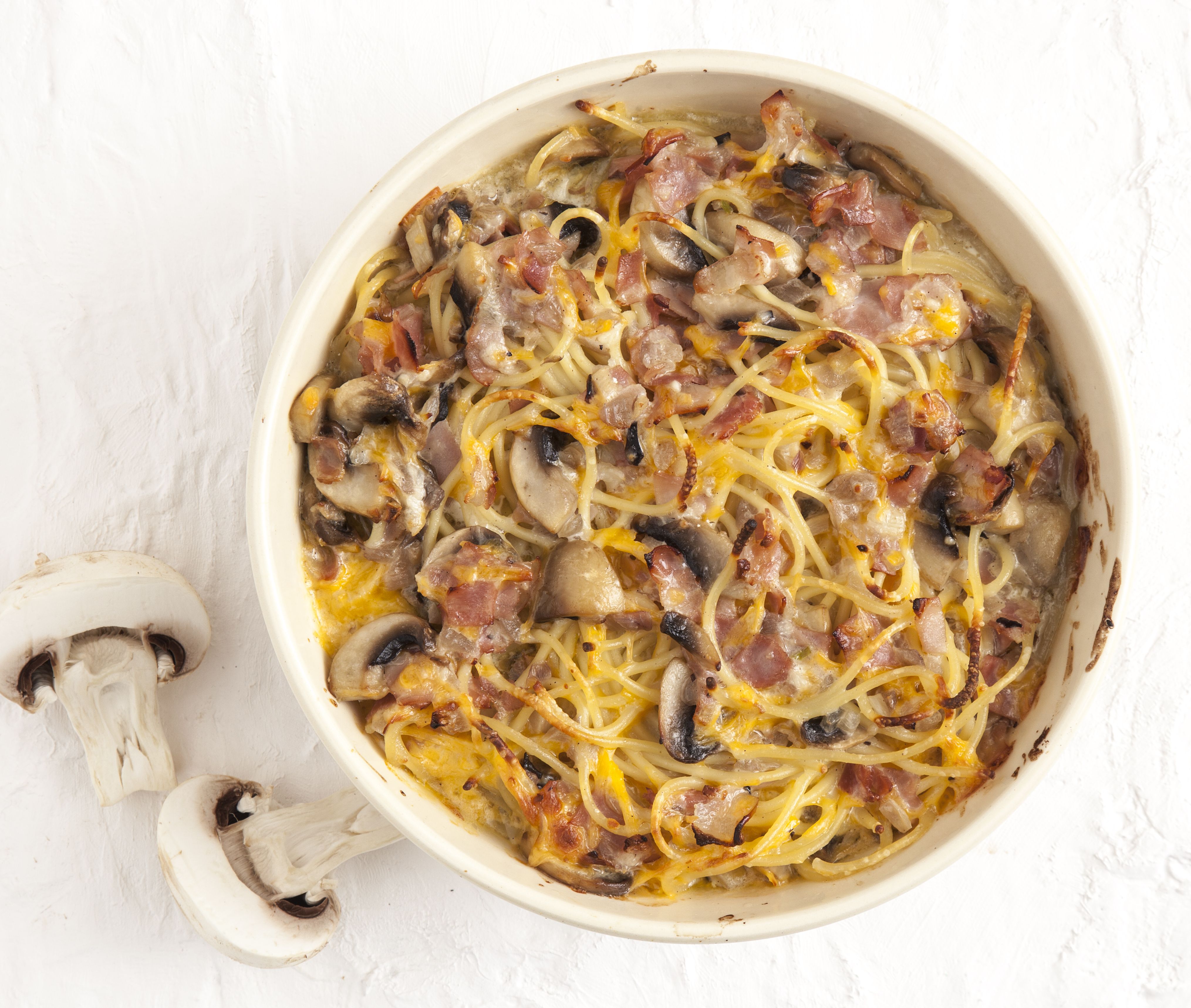Βράζουμε τα λιγκουίνι για 7 λεπτά σε νερό που κοχλάζει. Τα σουρώνουμε και τα κρυώνουμε με κρύο νερό. Προθερμαίνουμε τον φούρνο στους 180°C. Ρίχνουμε το βούτυρο σε μια κατσαρόλα και την τοποθετούμε στη φωτιά. Οταν ζεσταθεί, προσθέτουμε το σκόρδο, το κρεμμύδι, τα μανιτάρια, το ζαμπόν, αλάτι και πιπέρι και μαγειρεύουμε μέχρι να μαλακώσουν. Σβήνουμε με κρασί. Προσθέτουμε την κρέμα γάλακτος. Οταν το μείγμα πάρει μία βράση, το αδειάζουμε σε ένα πυρέξ. Ρίχνουμε από πάνω τα λιγκουίνι και τα τυριά και ανακατεύουμε καλά. Ψήνουμε για 25-30 λεπτά.