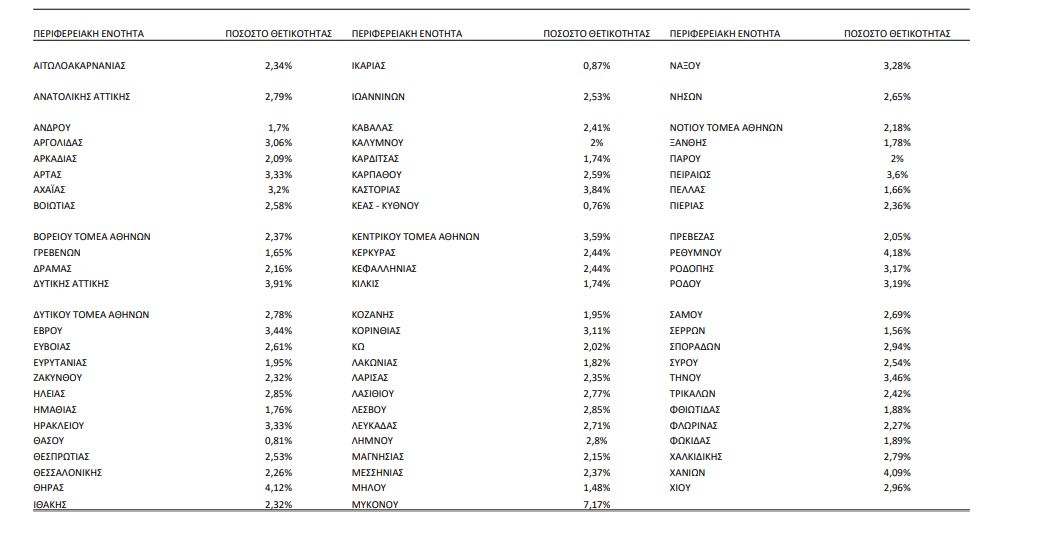Σύμφωνα με τα στοιχεία του ΕΟΔΥ, στο 4,18% είναι η θετικότητα στο Ρέθυμνο, ενώ στο 4,12% στη Σαντορίνη και στα Χανιά στο 4,09%. Υψηλά είναι η θετικότητα σε Καστοριά 3,84%, στον Κεντρικό Τομέα Αθηνών 3,59%, στην Δυτική Αττική με 3,91%, στην Τήνο με 3,46%, αλλά και στην Αρτα με 3,33%.