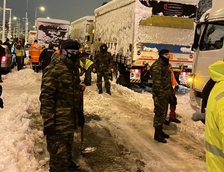 Οι ναύτες βγήκαν στην στεριά όχι όμως για περιπολία, όπως θα τραγουδούσε υπό άλλες συνθήκες η αείμνηστη Βίκυ Μοσχολιού, αλλά για να φτυαρίσουν χιόνι. Οι Ένοπλες Δυνάμεις της χώρας δηλαδή, κλήθηκαν ξαφνικά να πάρουν φτυάρια και να απομακρύνουν το χιόνι, μέσα στο κρύο και να φανερώσουν τα αυτοκίνητα που ήταν θαμμένα κάτω από όγκους χιονιού. Άγρυπνοι οι περισσότεροι φαντάροι από την προηγούμενη νύκτα: «Σε λίγο θα μας ζητήσουν να βάλουμε φαντάρους και στο διόδια», έλεγε ο υπουργός Άμυνας και ζήτησε την άμεση απόσυρση όχι μόνον των στρατιωτών, αλλά και των στρατιωτικών μηχανημάτων. Και όσα αυτοκίνητα έμεναν ακόμα εγκλωβισμένα; Ρωτήθηκε; «Αρμοδιότητα της Αττικής Οδού, είναι πλέον, ας φωνάξει τους οδηγούς να τα πάρουν. Ας κάνει τέλος πάντων και κάτι αυτή η εταιρία που δημιούργησε το πρόβλημα», έλεγαν από το υπουργείο Άμυνας την ώρα που οι κληρωτοί του Στρατού Ξηράς και του Πολεμικού Ναυτικού, τα Χάμερ, τα εκχιονιστικά και τα τζιπ επέστρεφαν στις βάσεις τους.