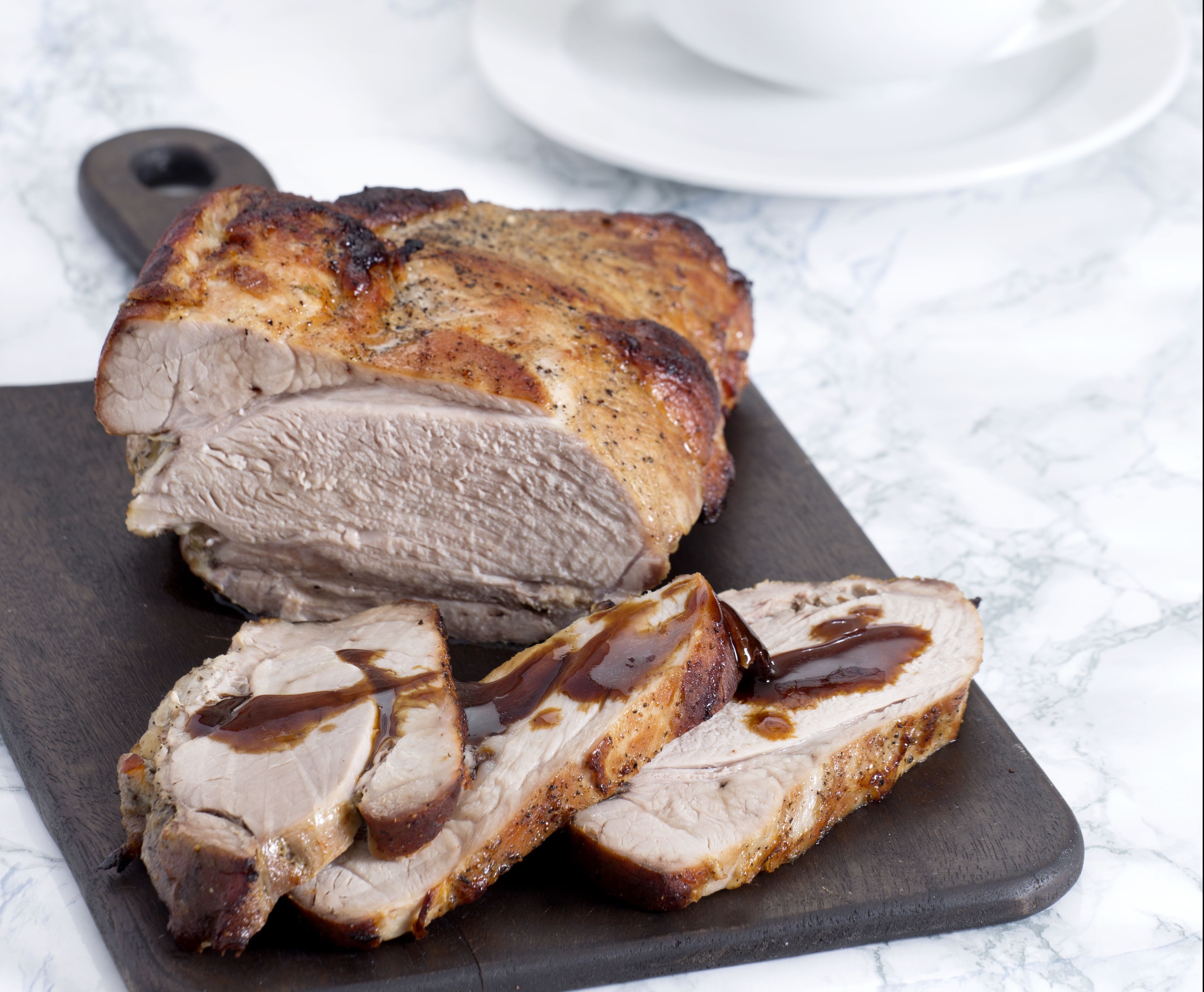 Σερβίρουμε το κρέας κομμένο σε φέτες περιχύνοντας με τη σάλτσα. Μπορούμε να συνοδεύσουμε με πουρέ πατάτας ή γλυκοπατάτας.