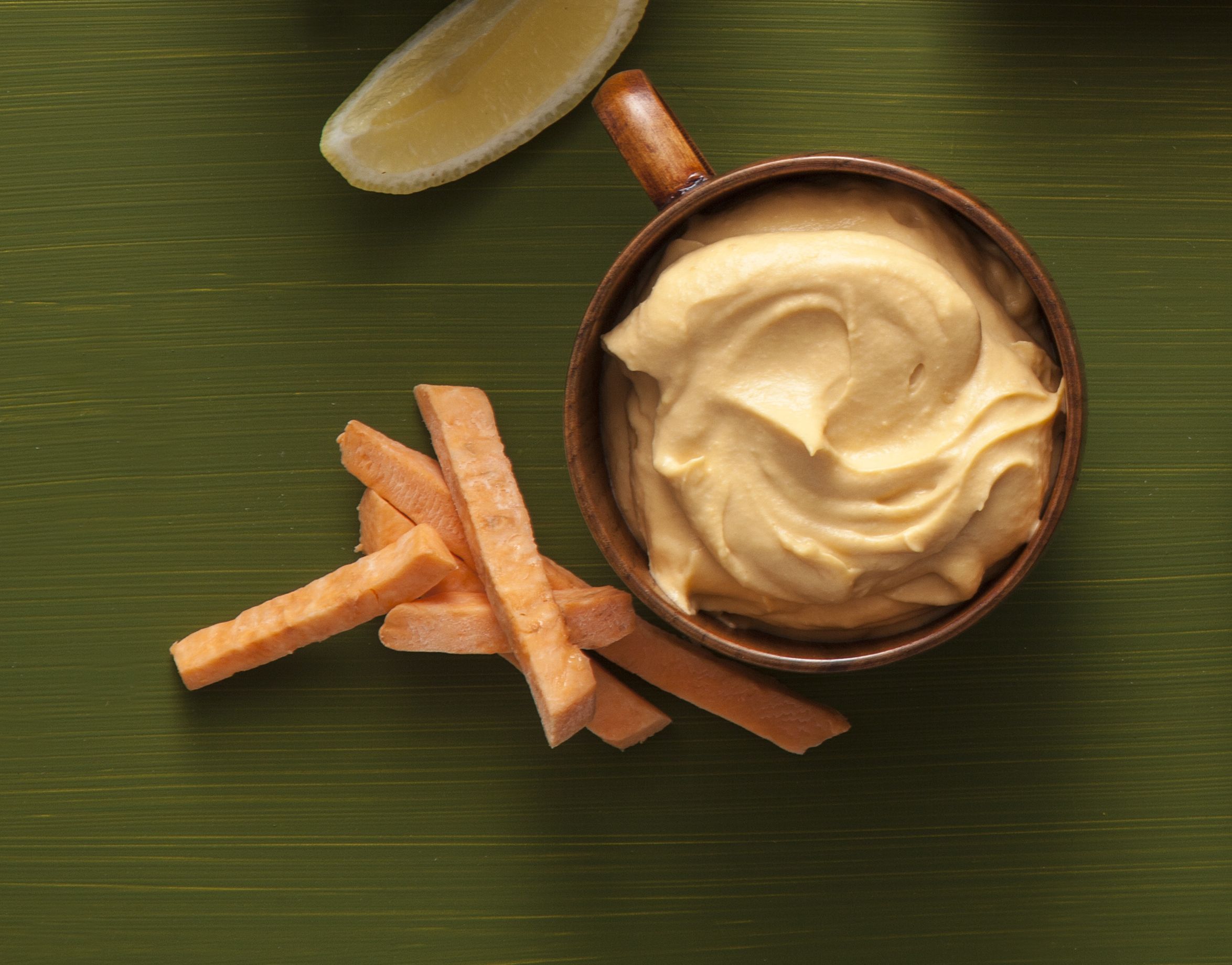 Προθερμαίνουμε τον φούρνο στους 190°C. Τυλίγουμε τις γλυκοπατάτες με λαδόκολλα και στη συνέχεια με αλουμινόχαρτο. Τις ψήνουμε για περίπου μία ώρα, να μαλακώσουν αρκετά. Τις βγάζουμε από τον φούρνο, τις ξετυλίγουμε και τις ξεφλουδίζουμε. Τις χτυπάμε στο μπλέντερ. Προσθέτουμε το κρεμμύδι, τον ταραμά και χυμό λεμονιού. Αλατοπιπερώνουμε. Συνεχίζουμε το χτύπημα και σταδιακά ρίχνουμε το ελαιόλαδο μέχρι το μείγμα να αποκτήσει κρεμώδη υφή.