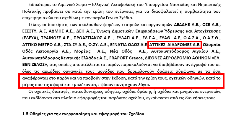 Ομως το πλέον εντυπωσιακό είναι ότι το εν λόγω σχέδιο, παρά τις εντυπωσιακές αναφορές του για προληπτικά μέτρα και συντονισμό των υπηρεσιών, αφήνει την υλοποίησή τους στην κρίση των περισσότερων φορέων. Οπως ενδεικτικά προτείνει σε 28 εταιρείες που εκμεταλλεύονται οδικές αρτηρίες (ανάμεσα σε αυτές τις Αττικές Διαδρομές) ή το σιδηροδρομικό δίκτυο, το μετρό, αεροδρόμια της χώρας αλλά και τη ΔΕΗ, την ΕΥΔΑπ κ.λπ., «παρακαλούνται να διαβιβάσουν αντίγραφό του “Βορέα” σε όλες τις αρμόδιες οργανικές τους μονάδες που δρομολογούν δράσεις, σύμφωνα με τα όσα αναφέρονται στο παρόν, και να προβούν στην έκδοση, κατά την κρίση τους, σχετικών οδηγιών κατά το μέρος που τις αφορά και εμπλέκονται, εφόσον συντρέχουν λόγοι. Οι σχετικές διαταγές, κατευθυντήριες οδηγίες, σχέδια δράσης ή σχέδια και μνημόνια ενεργειών που εκδίδονται στο πλαίσιο εφαρμογής του παρόντος σχεδίου εγκρίνονται από τις διοικήσεις τους».