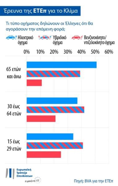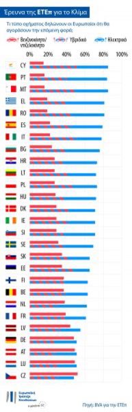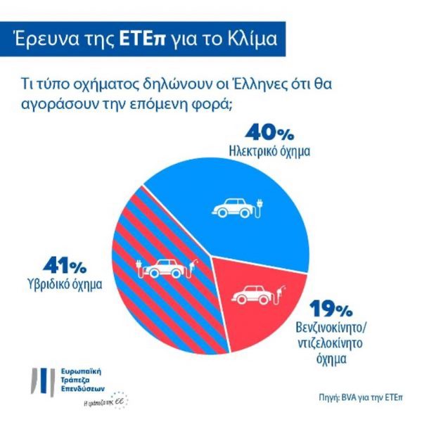 Στην ερώτηση σχετικά με μελλοντική αγορά αυτοκινήτου, το 81% των Ελλήνων δηλώνουν ότι θα αγοράσουν είτε υβριδικό είτε ηλεκτρικό αυτοκίνητο. Αυτό το ποσοστό είναι κατά 62 μονάδες υψηλότερο από το ποσοστό των Ελλήνων που δηλώνουν ότι θα αγόραζαν ντιζελοκίνητο ή βενζινοκίνητο όχημα (19%). Ειδικότερα, το 41% θα αγόραζε υβριδικό όχημα και το 40% θα επέλεγε ηλεκτρικό όχημα.
