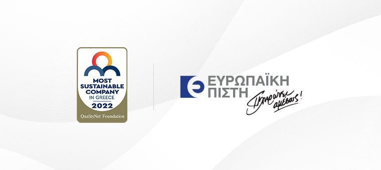 Η Ευρωπαϊκή Πίστη ανακηρύχθηκε ως Πρωτοπόρος Οργανισμός για την εφαρμογή και την προώθηση της Βιώσιμης Ανάπτυξης και της Υπεύθυνης Επιχειρηματικότητας και εντάχθηκε για ακόμη μία χρονιά στην ομάδα των «The Most Sustainable Companies in Greece 2022», στην εκδήλωση που πραγματοποιήθηκε τη Δευτέρα 07 Φεβρουαρίου 2022, όπου και παρουσιάστηκαν οι επιχειρήσεις – πρότυπα – που αναδεικνύουν τον Επιχειρηματικό Χάρτη της Βιώσιμης Ανάπτυξης στη χώρα μας.