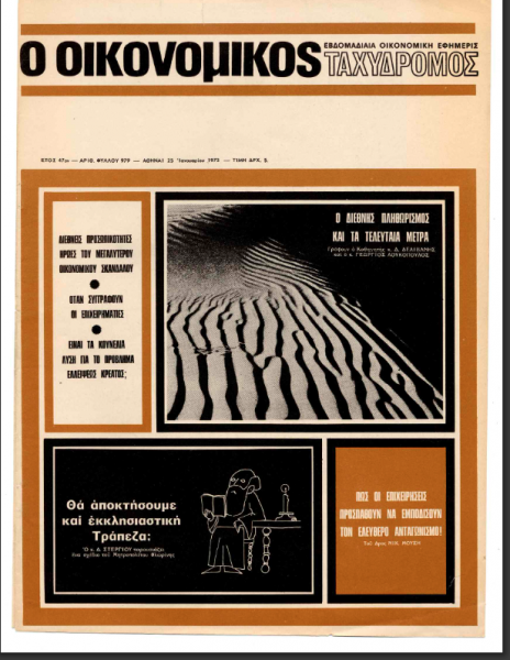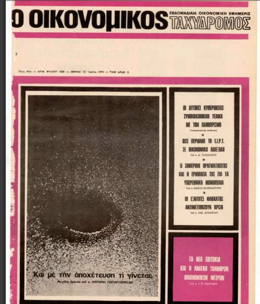 Μετά από μία μεγάλη μεταπολεμική περίοδο σταθερότητας των τιμών που συνδυάστηκε και από υψηλούς ρυθμούς ανάπτυξης, η παγκόσμια (και η Ελληνική) οικονομία βίωσαν το 1973 μία έκρηξη του πληθωρισμού (ΗΠΑ 9,6%) που είχε, σχεδόν όπως και σήμερα προέλευση το ενεργειακό κόστος (πληθωρισμός προσφοράς) λόγω των γεωστρατηγικών αναταραχών στην Μέση Ανατολή. Τότε, το ενεργειακό περιεχόμενο των προϊόντων ήταν πολύ υψηλό και οι οικονομίες και υπηρεσίες δεν είχαν το ρόλο που έχουν σήμερα στο ΑΕΠ.