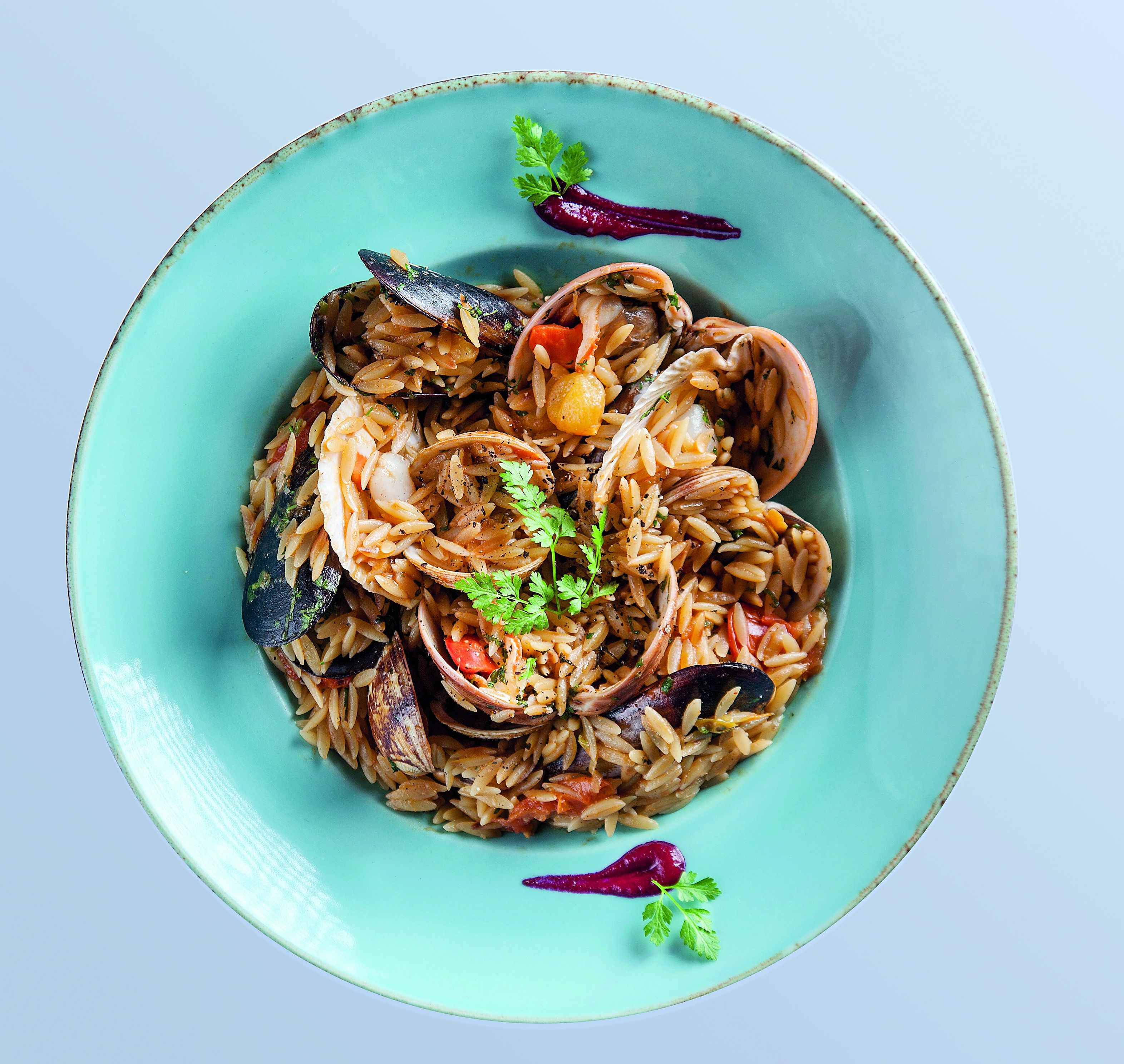 Σε μια άλλη, μεγάλη κατσαρόλα, σοτάρουμε σε 1 κουτ. σούπας ελαιόλαδο το υπόλοιπο κρεμμύδι, το σκόρδο και την ντομάτα για μερικά λεπτά. Αλατίζουμε ελαφρώς και σβήνουμε με το κρασί. Οταν εξατμιστεί το αλκοόλ, προσθέτουμε τα όστρακα, ανακατεύουμε απαλά και σκεπάζουμε την κατσαρόλα με το καπάκι της. Μαγειρεύουμε για 3 λεπτά σε δυνατή φωτιά. Ξεσκεπάζουμε και ρίχνουμε μέσα το κριθαράκι ανακατεύοντας συνεχώς για 7-8 λεπτά, μέχρι να μαλακώσει. Αν είναι πολύ στεγνό, μπορούμε να προσθέσουμε με προσοχή λίγο νεράκι. Το κριθαράκι μας το θέλουμε al dente, οπότε προσέχουμε να μην παραμαγειρευτεί. Τέλος, τρίβουμε από πάνω μαύρο πιπέρι και περιχύνουμε με λίγο φρέσκο ελαιόλαδο. Σερβίρουμε αμέσως.