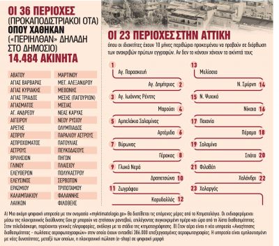 Τα ακίνητα αυτά βρίσκονται σε 36 περιοχές σε όλη τη χώρα, στις οποίες οι κτηματολογικές εγγραφές οριστικοποιήθηκαν το 2018 και συνεπώς δεν υφίστανται πλέον προθεσμία διόρθωσης. Τα συνολικά δικαιώματα που καταγράφηκαν στις περιοχές αυτές ανέρχονται στα 199.013 με το 7,28% (δηλαδή 14.484) να χαρακτηρίζονται «άγνωστου ιδιοκτήτη». Πλήρης εικόνα όσον αφορά σε ποιον ανήκουν αυτά τα ακίνητα δεν υπάρχει. Η εκτίμηση ωστόσο είναι πως οκτώ στα δέκα ανήκουν ήδη στο Δημόσιο.