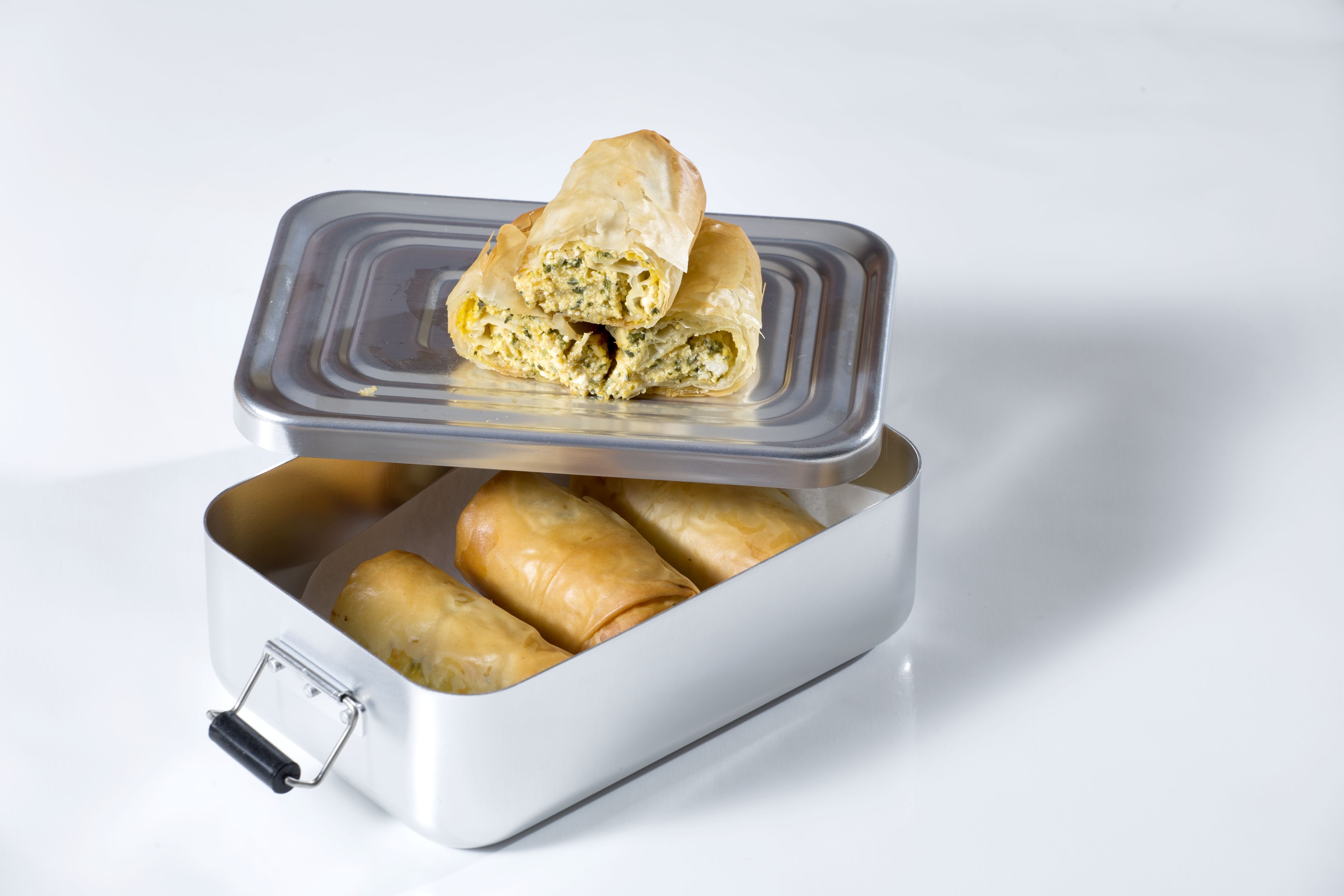 Προθερμαίνουμε τον φούρνο στους 180οC. Απλώνουμε τα φύλλα κρούστας στον πάγκο εργασίας ανά τρία. Χαράζουμε τα φύλλα με ένα μυτερό μαχαίρι ώστε να σχηματίσουμε τετράγωνα των 17-20 εκ. Βάζουμε στο κέντρο του κάθε τετραγώνου 2 κουτ. του γλυκού από το μείγμα της γέμισης και το τυλίγουμε με τον ίδιο τρόπο που τυλίγουμε τους ντολμάδες. Διπλώνουμε πρώτα τις δυο πλευρές (δεξιά και αριστερά) προς τα μέσα, πιάνουμε την κάτω πλευρά του φύλλου, τη διπλώνουμε πάνω από τη γέμιση και αρχίζουμε να ρολάρουμε προς τα επάνω σφιχτά αλλά και με προσοχή για να μη σκιστεί το φύλλο. Επαναλαμβάνουμε μέχρι να τελειώσουν τα υλικά. Απλώνουμε λαδόκολλα σε ένα ταψί και αραδιάζουμε τα ρολάκια φροντίζοντας να υπάρχει απόσταση μεταξύ τους, ώστε να μην κολλήσουν κατά τη διάρκεια του ψησίματος. Χτυπάμε το δεύτερο αβγό σε ένα μπολάκι και με ένα πινέλο αλείφουμε καλά τα ρολά μας. Ψήνουμε για περίπου 20′ μέχρι να ροδίσουν ομοιόμορφα.