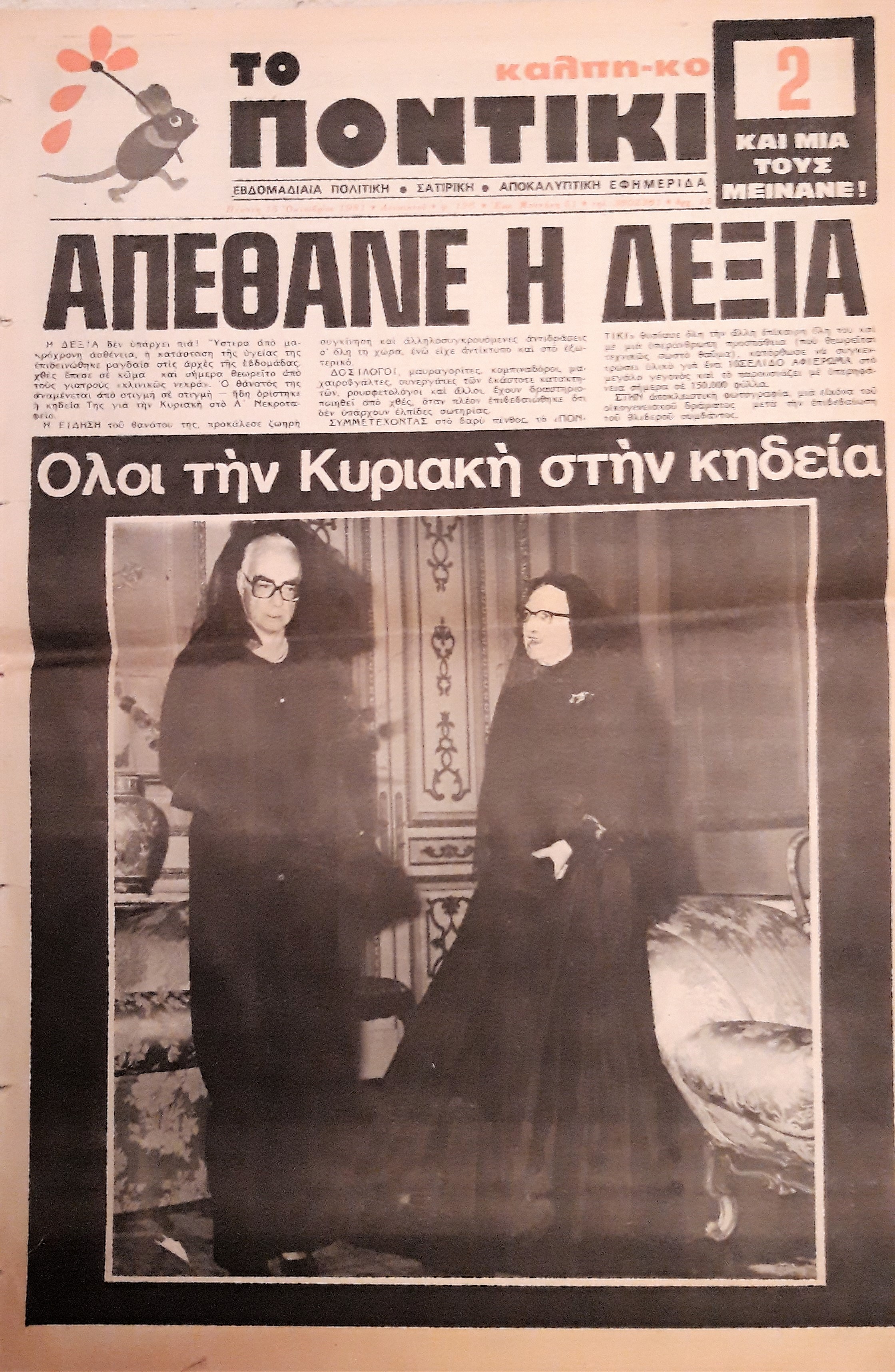 Στο φύλλο της 15ης Οκτωβρίου 1981 το οποίο ήταν …πένθιμο, λόγω του επικείμενου (τρεις ημέρες μετά) «θανάτου της Δεξιάς» από το ΠΑΣΟΚ του Ανδρέα Παπανδρέου, υπήρχε μια παραλλαγμένη εκδοχή από το «Τρίτο Στεφάνι» του Κώστα Ταχτσή (δια χειρός …Κώστα Αχτσή).