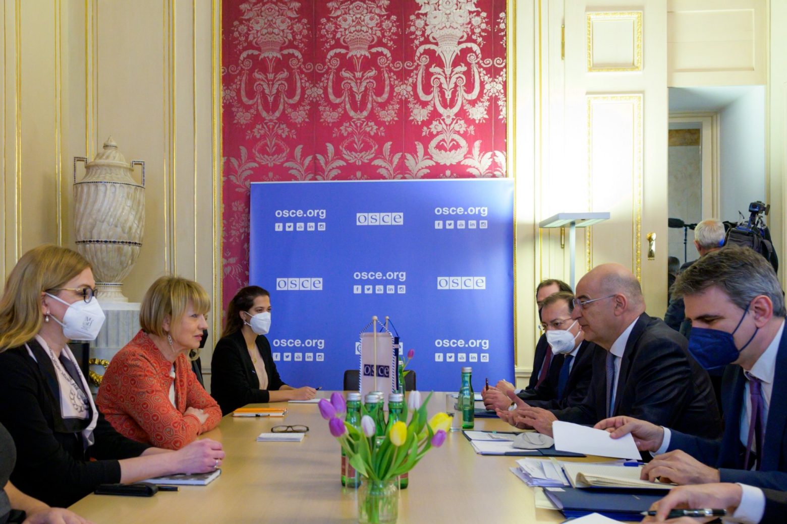 Μακρά συζήτηση με τη γενική γραμματέα του ΟΑΣΕ, Χέλγκα Σμιντ, με κύριο αντικείμενο τα ζητήματα που αφορούν στη Μαριούπολη και στην ασφάλεια του Έλληνα προξένου, που φιλοξενείται αυτή τη στιγμή στο κτίριο του ΟΑΣΕ στη Μαριούπολη, είχε στη Βιέννη ο υπουργός Εξωτερικών, Νίκος Δένδιας.
