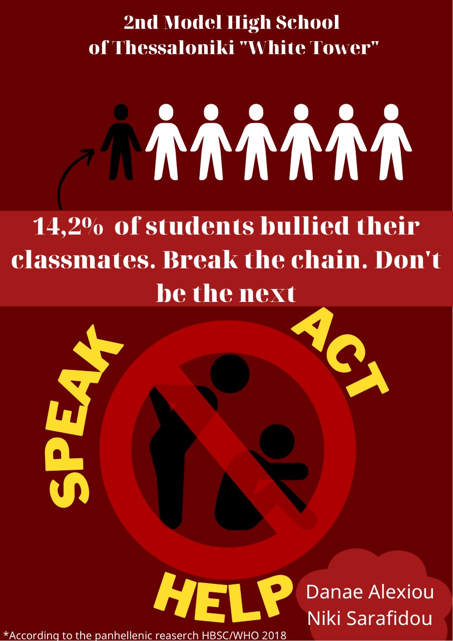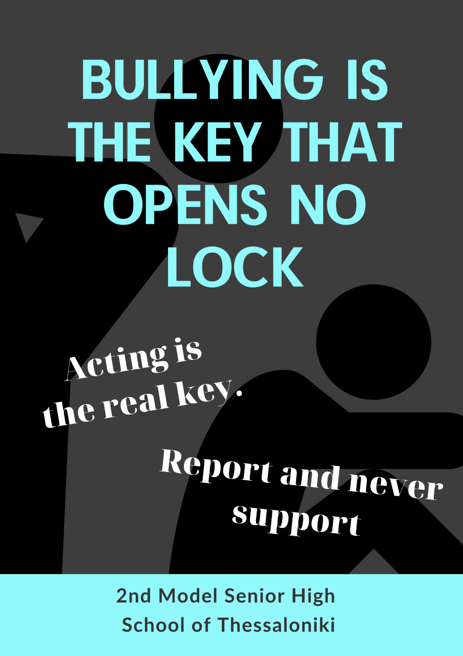 Γιορτάζοντας την ημέρα κατά της ενδοσχολικής βίας 2022, τα τμήματα του σχολείου μας Α1, Α2 και Β1, δημιούργησαν ψηφιακές αφίσες για να εκφράσουν την αντίθεσή τους σε κάθε μορφή εκφοβισμού, να παρακινήσουν και άλλους μαθητές και μαθήτριες να καταγγείλουν παρόμοια φαινόμενα και να ταχθούν υπέρ ενός συμπεριληπτικού σχολείου, που αποτελεί ευνοϊκό περιβάλλον μάθησης και χαρακτηρίζεται από σεβασμό προς τον άλλο, αλληλεγγύη, αλληλοκατανόηση και ενσυναίσθηση.