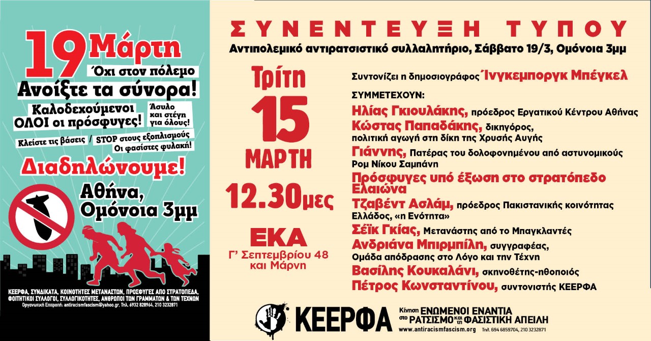 Συνέντευξη Τύπου για το αντιπολεμικό αντιρατσιστικό συλλαλητήριο που θα πραγματοποιηθεί στις 19 Μαρτίου, στην Ομόνοια, στις 3μμ, διοργανώνεται αύριο, Τρίτη, 15 Μαρτίου, στις 12:30μμ. στο Εργακτικό Κέντρο Αθήνας, Γ’ Σεπτεμβρίου 48 και Μάρνη.