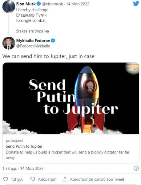 Μάλιστα, έλαβε και μια απάντηση από τον αναπληρωτή πρωθυπουργό και υπουργό Ψηφιακής Διακυβέρνησης της Ουκρανίας, Μιχάιλο Φεντόροφ, ο οποίος πρότεινε στον CEO της Τesla να στείλουν τον Ρώσο ηγέτη στον… Δία, παραθέτοντας ένα link για μια διαδικτυακή πρωτοβουλία αποστολής πυραύλου με τον Πούτιν στον μακρινό πλανήτη.