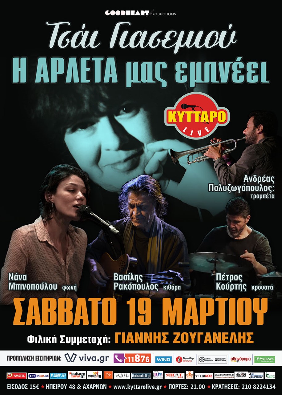 Το Σάββατο 19 Μαρτίου το Κύτταρο live θα φιλοξενήσει μια σπουδαία μουσική παρέα σε μια βραδιά αφιερωμένη στα τραγούδια της Αρλέτας. Ο Βασίλης Ρακόπουλος, στενός φίλος και συνεργάτης της για πολλές δεκαετίες, και η  Νάνα Μπινοπούλου, μαζί με τους μουσικούς Ανδρέα Πολυζωγόπουλο και Πέτρο Κούρτη, ξαναζωντανεύουν τραγούδια της Αρλέτας και των αγαπημένων της συνθετών Μάνου Χατζιδάκι και Γιάννη Σπανού. Στη βραδιά συμμετέχει ο Γιάννης Ζουγανέλης.