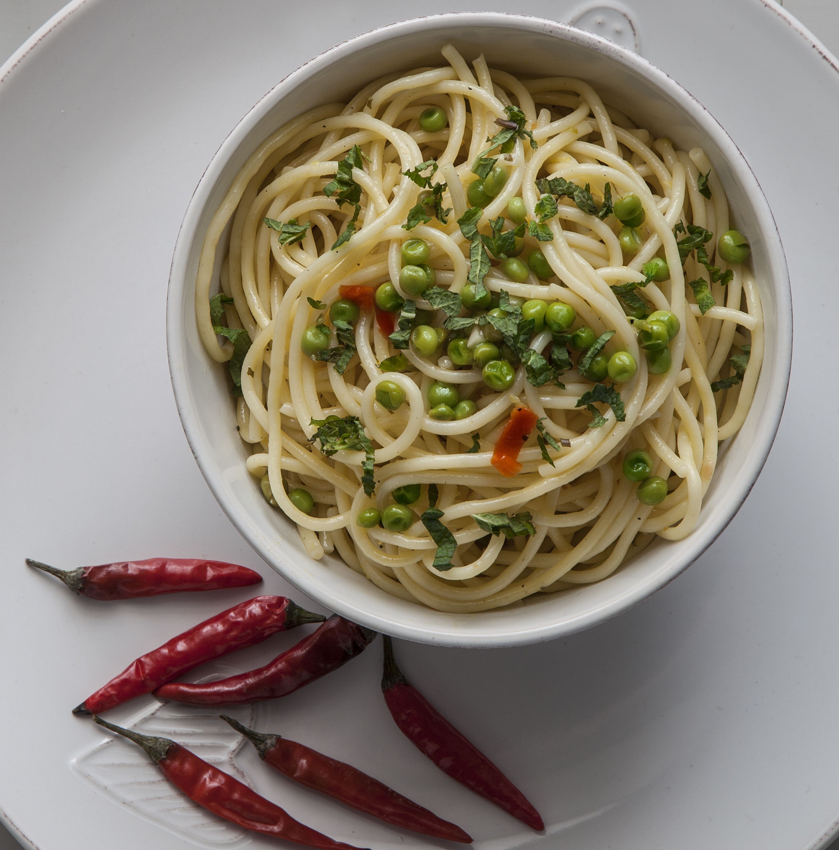 Σε μια κατσαρόλα με αλατισμένο νερό βράζουμε τα σπαγγέτι μαζί με τον αρακά, σύμφωνα με τις οδηγίες της συσκευασίας ώστε να είναι τα ζυμαρικά al dente. Κρατάμε λίγο από το νερό στο οποίο θα βράσουμε τα ζυμαρικά, σε περίπτωση που χρειαστεί να συμπληρώσουμε υγρά.
