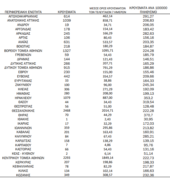 Επιπλέον, 38 περιοχές καταγράφουν τριψήφιο αριθμό κρουσμάτων.