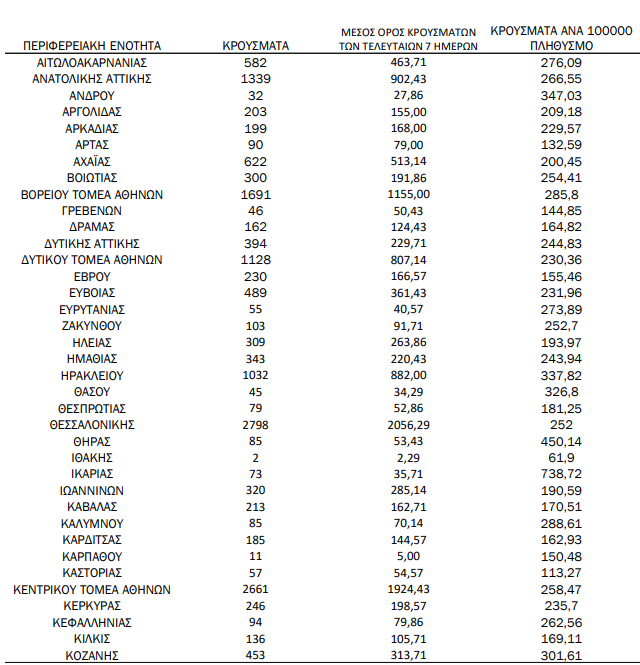 Επιπλέον, 41 περιοχές καταγράφουν τριψήφιο αριθμό κρουσμάτων.