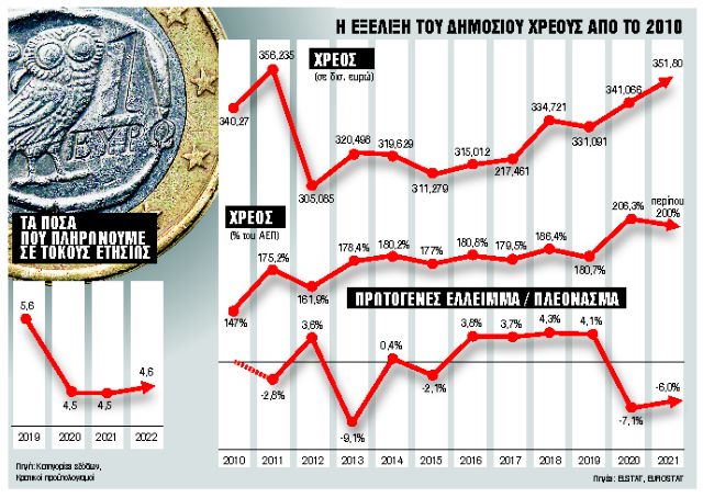 Στην περίπτωση της χώρας μας τα στοιχεία «ζαλίζουν»: μόνο κατά την περίοδο της πανδημίας η συνολική αξία του ακαθάριστου δημόσιου χρέους αυξήθηκε κατά 32 δισ. ευρώ και εκτοξεύτηκε στα 388,337 δισ. ευρώ στο τέλος Δεκεμβρίου 2021 από 356,014 δισ. ευρώ τον Δεκέμβριο του 2019. Σύμφωνα με τα τελευταία στοιχεία της Eurostat, το χρέος αυξήθηκε στο 200,7% του ΑΕΠ έναντι 207,3% στο δεύτερο τρίμηνο (στα 357,3 δισ. ευρώ από 354 δισ. ευρώ), όταν στην ευρωζώνη ο μέσος όρος είναι στο 98,6%.