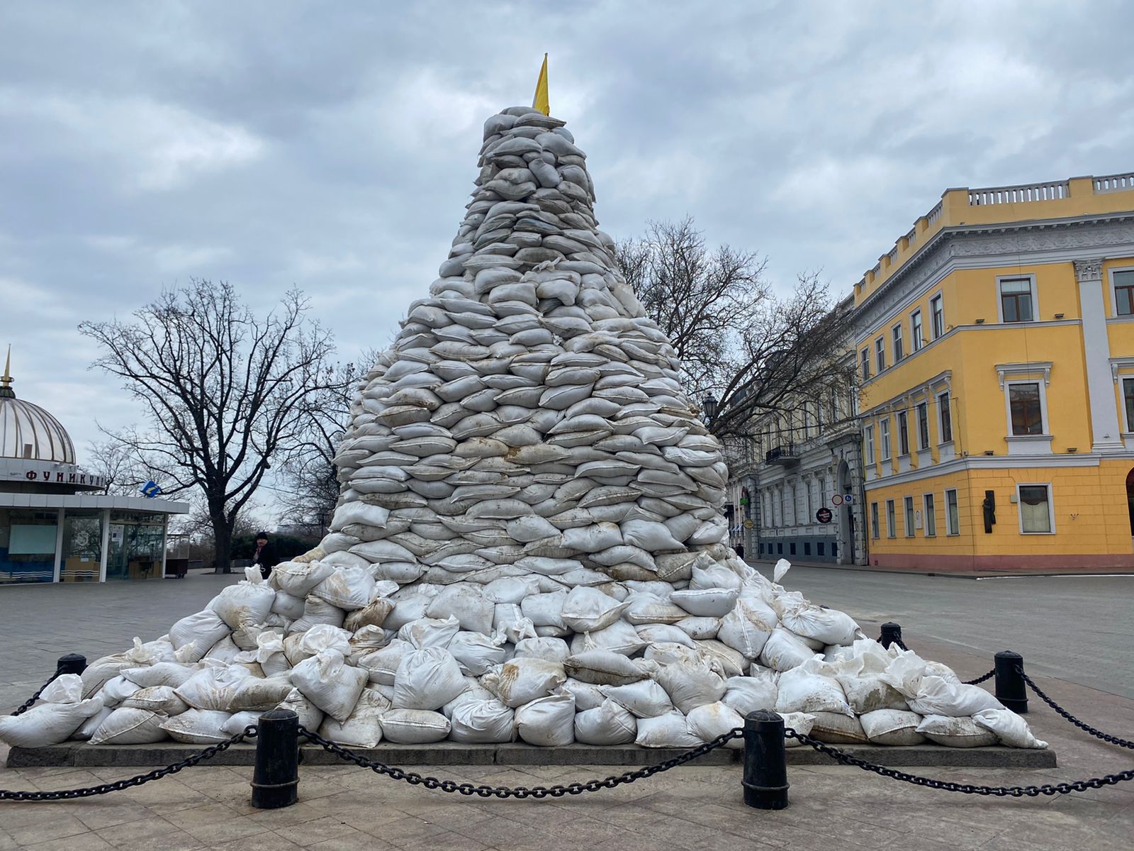 Στην Οδησσό οι κάτοικοί της πρώτα απ΄όλα αντί να φροντίσουν τα καταφύγια για να προφυλαχθούν από τις ρωσικές οβίδες, φρόντισαν για την ασφάλεια των αγαλμάτων της πόλης, όπως του Δούκα του Ρισελιέ. Έχουν ένα παράξενο τρόπο οι Ουκρανοί της Οδησσού να προφυλάσσουν τα αγάλματά τους. Τα θωρακίζουν με σακιά από άμμο και πάνω σε αυτά τοποθετούν μια σημαία. Στο άγαλμα του Ρισελιέ τοποθέτησαν την τρίχρωμη σημαία της Οδησσού (κόκκινο, κίτρινο και στη μέση λευκό με ένα κάστρο).