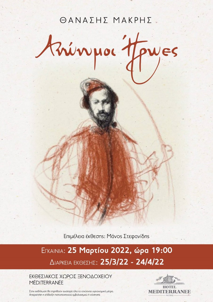 Την Παρασκευή, 25η Μαρτίου, στο αίθριο του ξενοδοχείου Méditerranée της Πάτρας εγκαινιάζεται η έκθεση σχεδίων του Θανάση Μακρή με τίτλο “Ανώνυμοι Ήρωες”. Πρόκειται για έργα την ενότητα “Εν Ξιφήρεις” που πρωτοπαρουσιάστηκε πέρσι στην Εθνική Βιβλιοθήκη – Ίδρυμα Σταύρος Νιάρχος με πολύ μεγάλη επιτυχία.