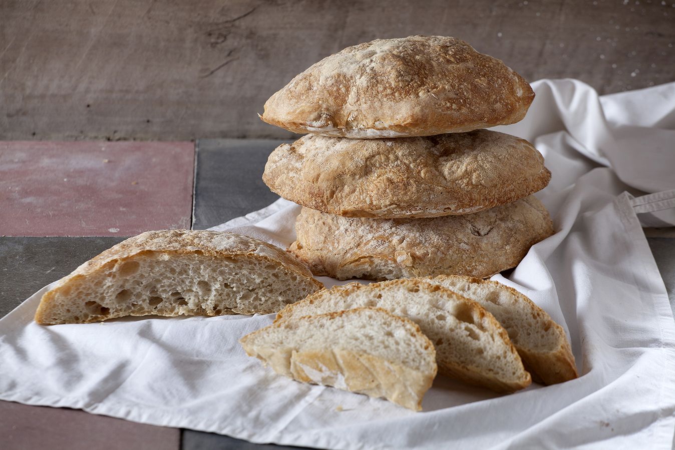 Αφού πλάσουμε τα καρβέλια, τα πασπαλίζουμε με αλεύρι και τα ξανασκεπάζουμε με τις πετσέτες μέχρι να ξαναφουσκώσουν, για 1 – 1½ ώρα. Προθερμαίνουμε τον φούρνο στους 200°C. Ψήνουμε για 20 – 30 λεπτά, μέχρι να ροδοκοκκινίσουν τα καρβέλια και να είναι τραγανή η κρούστα τους. Καταλαβαίνουμε ότι είναι έτοιμα αν χτυπήσουμε απαλά το κάτω μέρος με τις αρθρώσεις τον δακτύλων και ακουστεί σαν να είναι κούφια. Αφήνουμε να κρυώσουν λίγο πάνω σε μια σχάρα φούρνου.